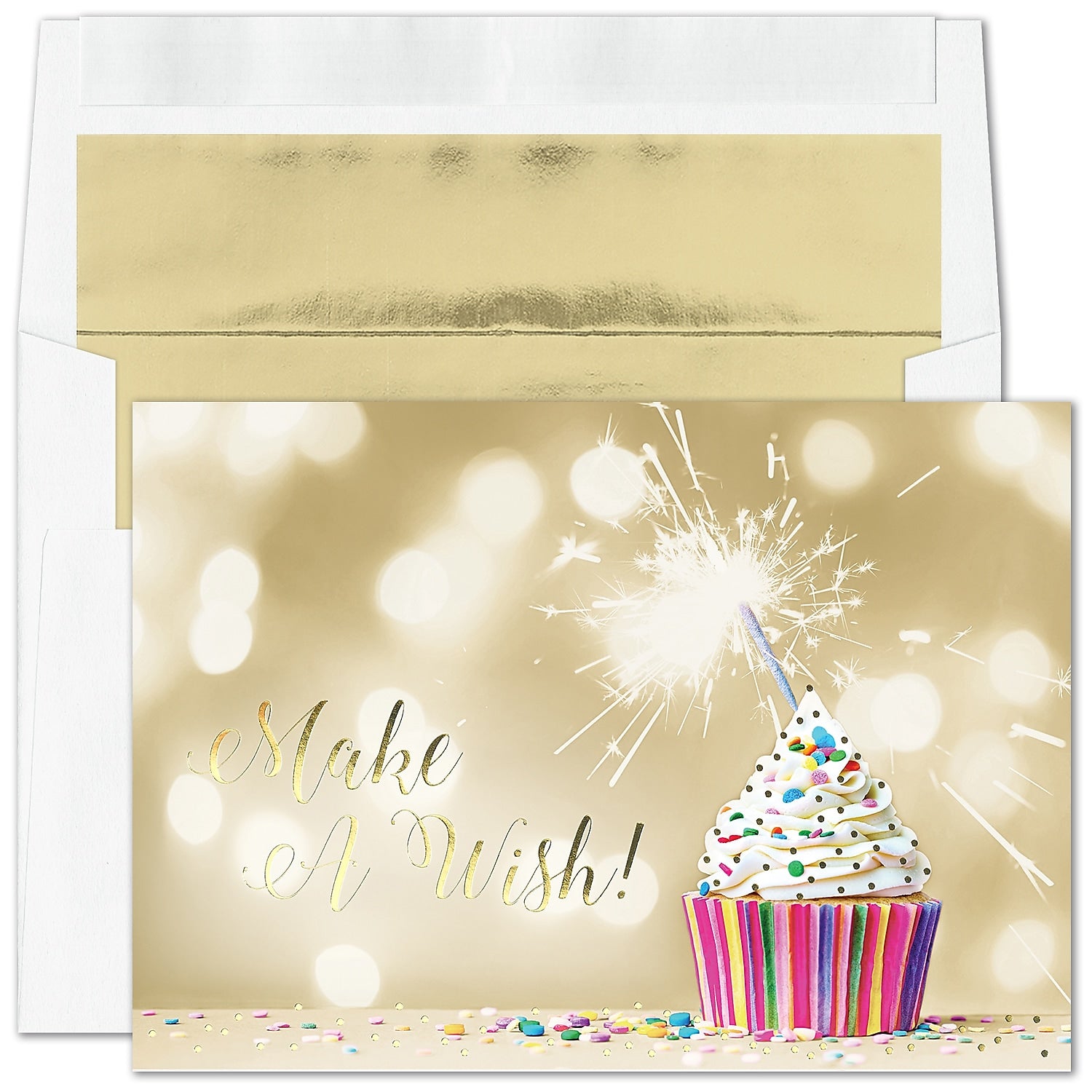 "Make a Wish Cupcake" Card w/ Gold Lined White Envelope, 25/BX