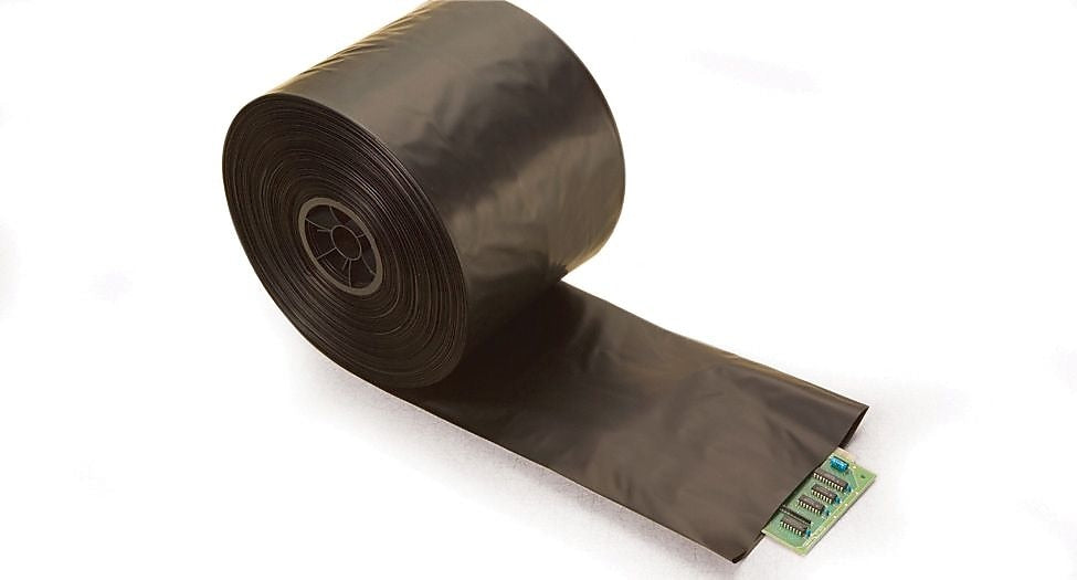 6" x 750' Conductive tubing in black color safeguard electrostatic charge, chemicals, abrasion and humidity. Bag is easily wound on a 3" core with 1" Die core plug, sold as 750 per roll.