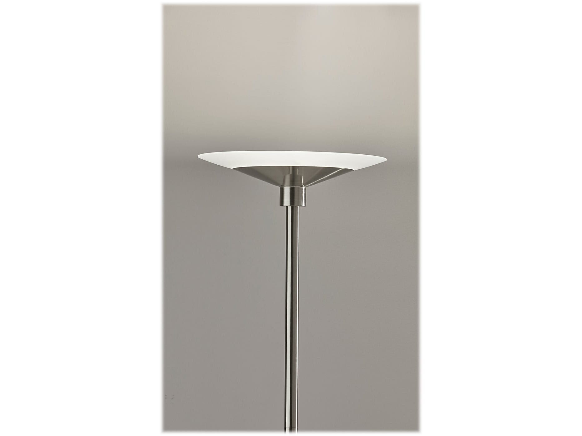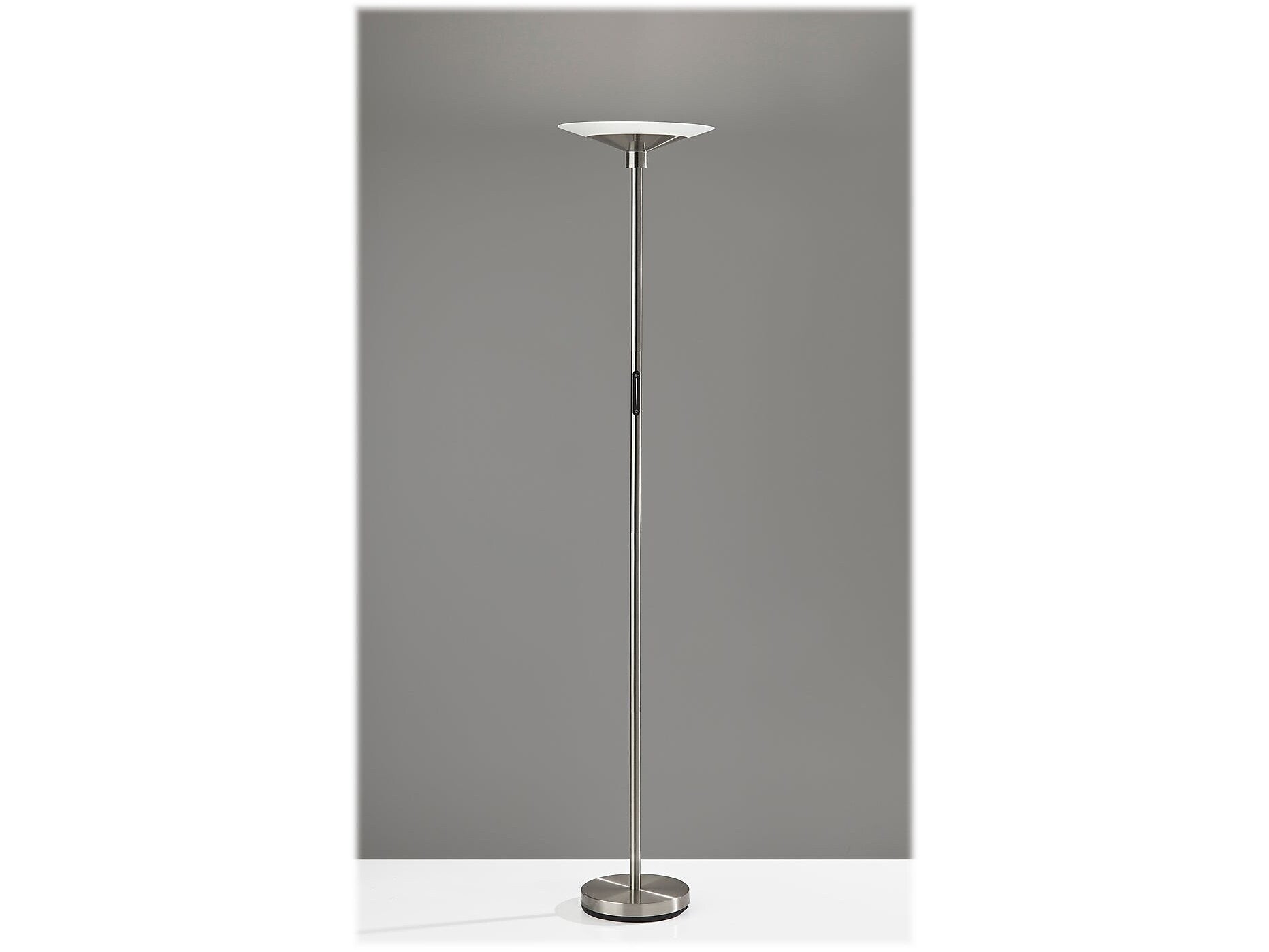 Featuring a sleek, modern style, the Adesso Solar LED torchiere supports wellness by syncing your indoor lighting with your circadian rhythm. By adjusting your lamp's color temperature throughout the day, you can simulate the natural progression of the sun, helping regulate the body's internal clock to improve sleep habits and overall personal health. The color of the light is controlled by a sleek touch switch located on the pole, which is also used to adjust the light intensity, offering a full range of brightness options. With a brushed steel finish and a frosted glass shade, the torchiere offers a modern, versatile look that will fit in and elevate any home style. Place this lamp in your living room or bedroom to fill the room with 2200 lumens of bright, ambient lighting.