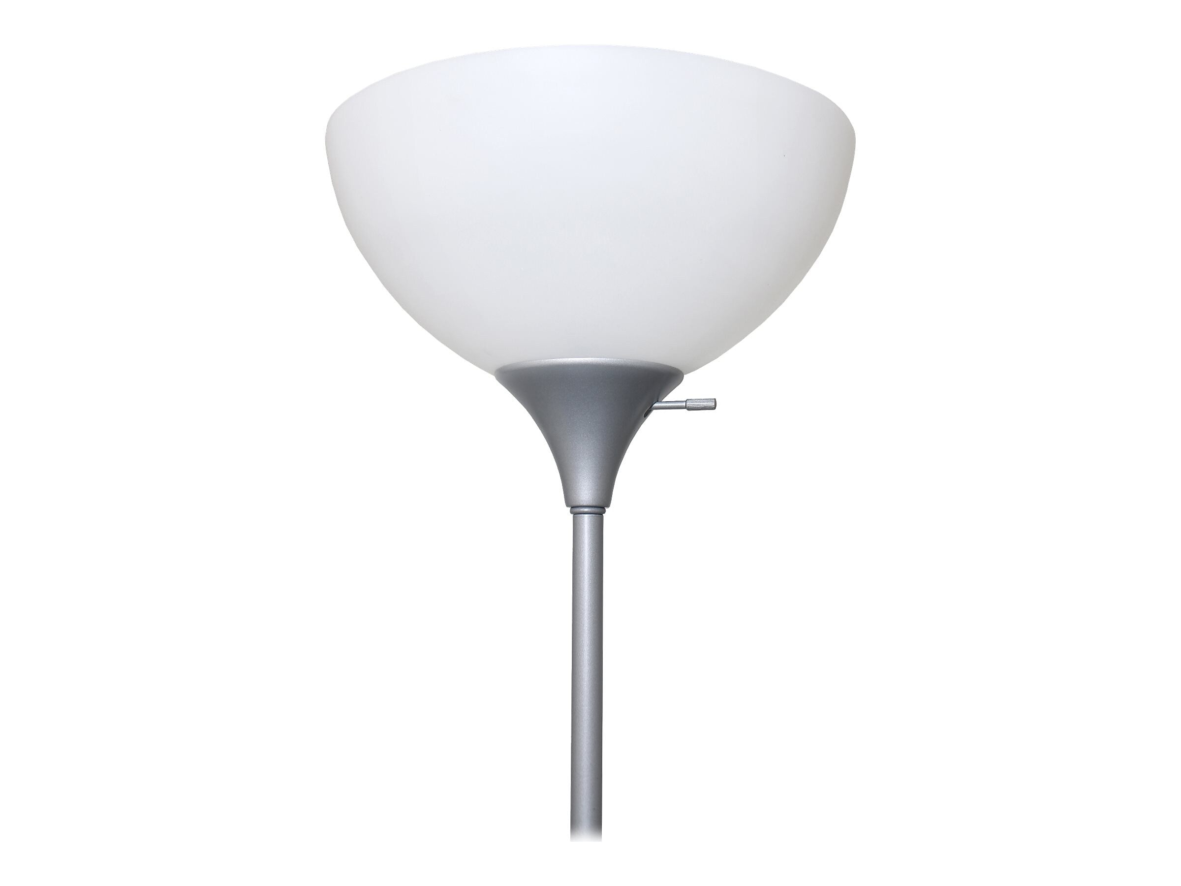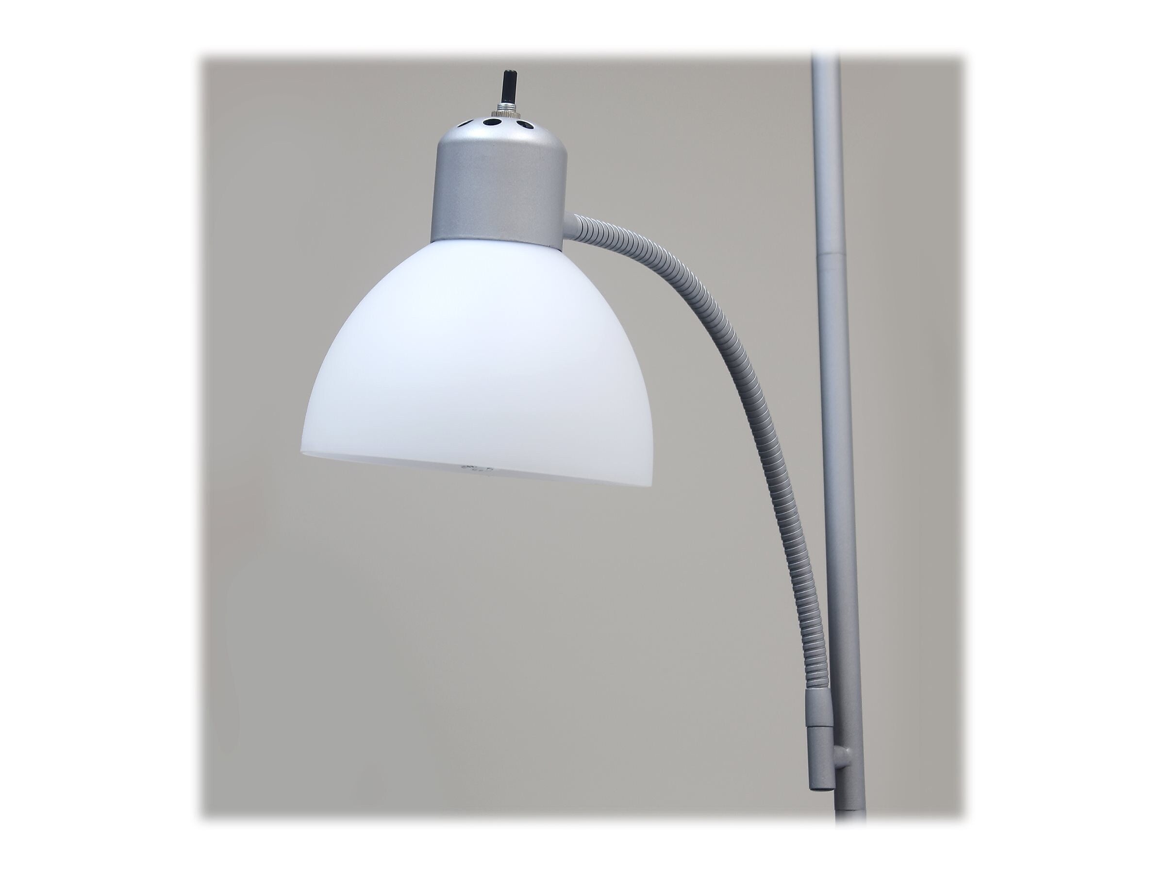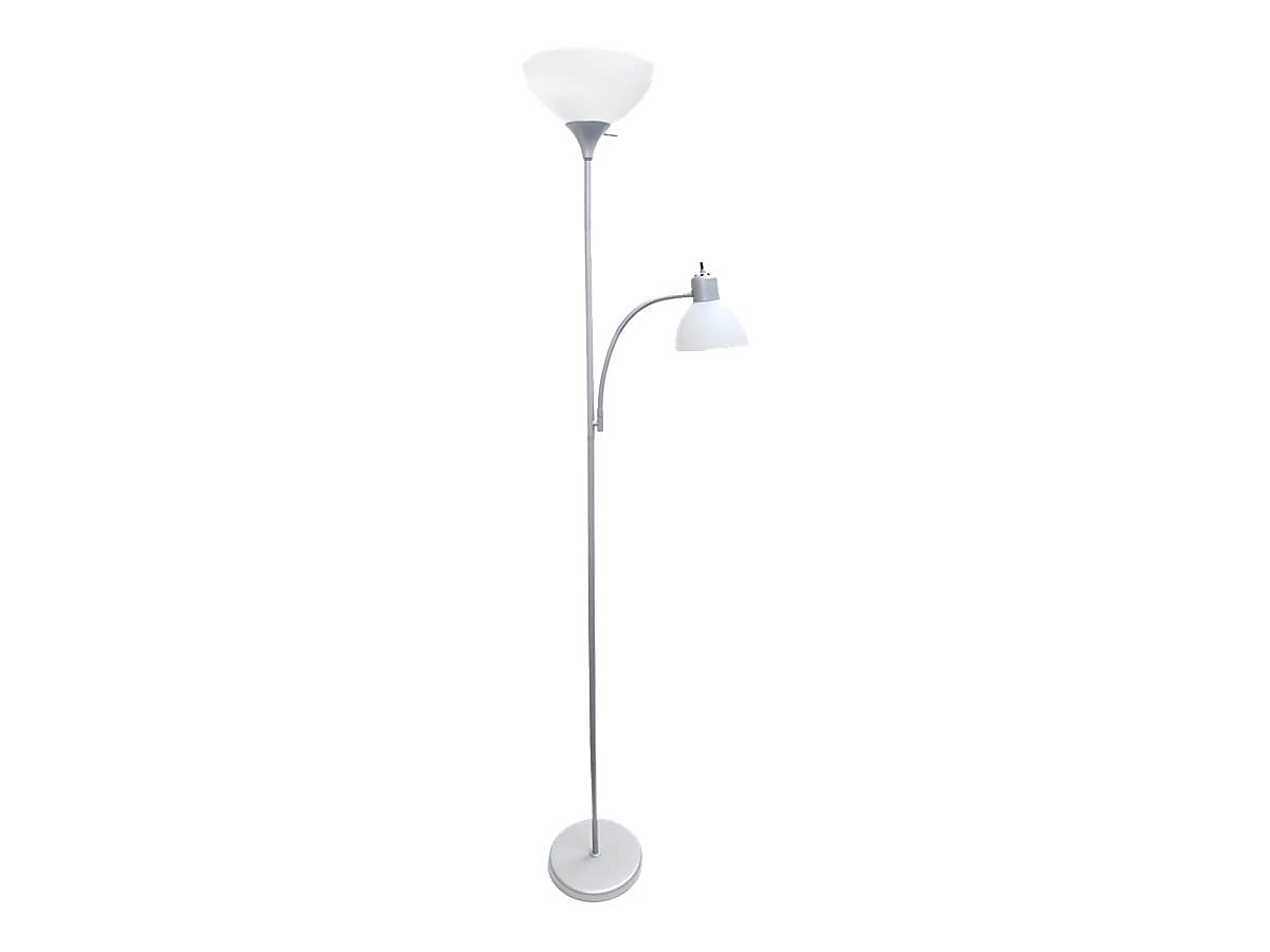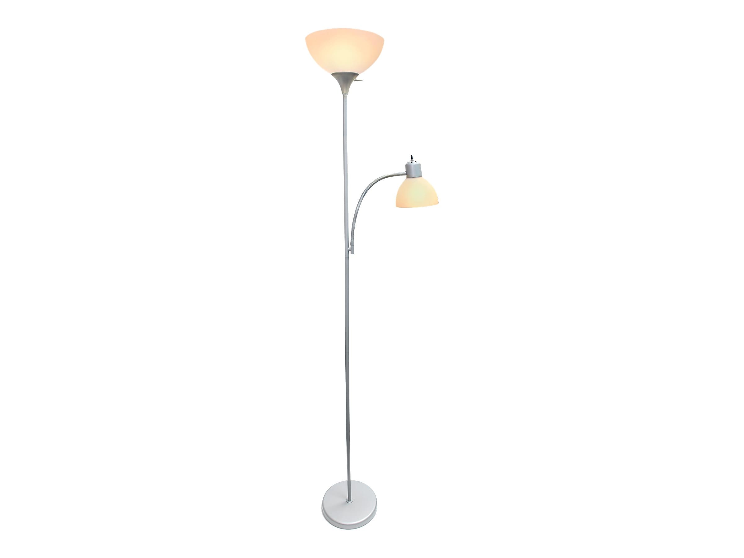 Customize home or office lighting with this contemporary silver floor lamp. Adjust the reading light to the perfect position for close work or use the main bulb to illuminate the room. This Simple Designs floor lamp includes two white bell shades that brilliantly diffuse light at any time of day.