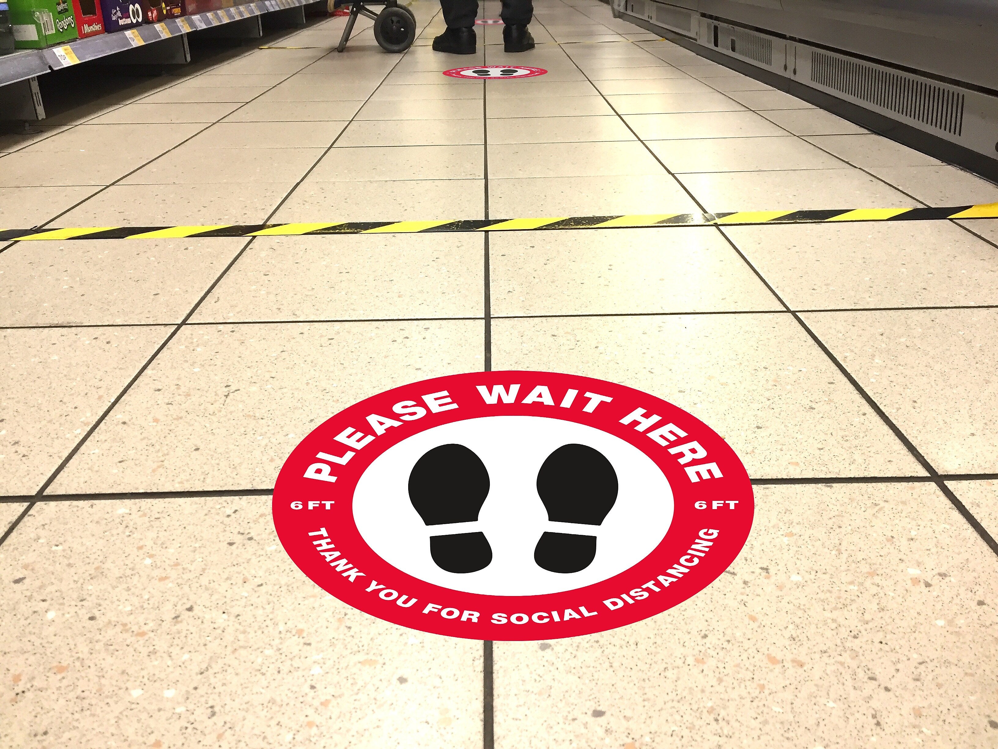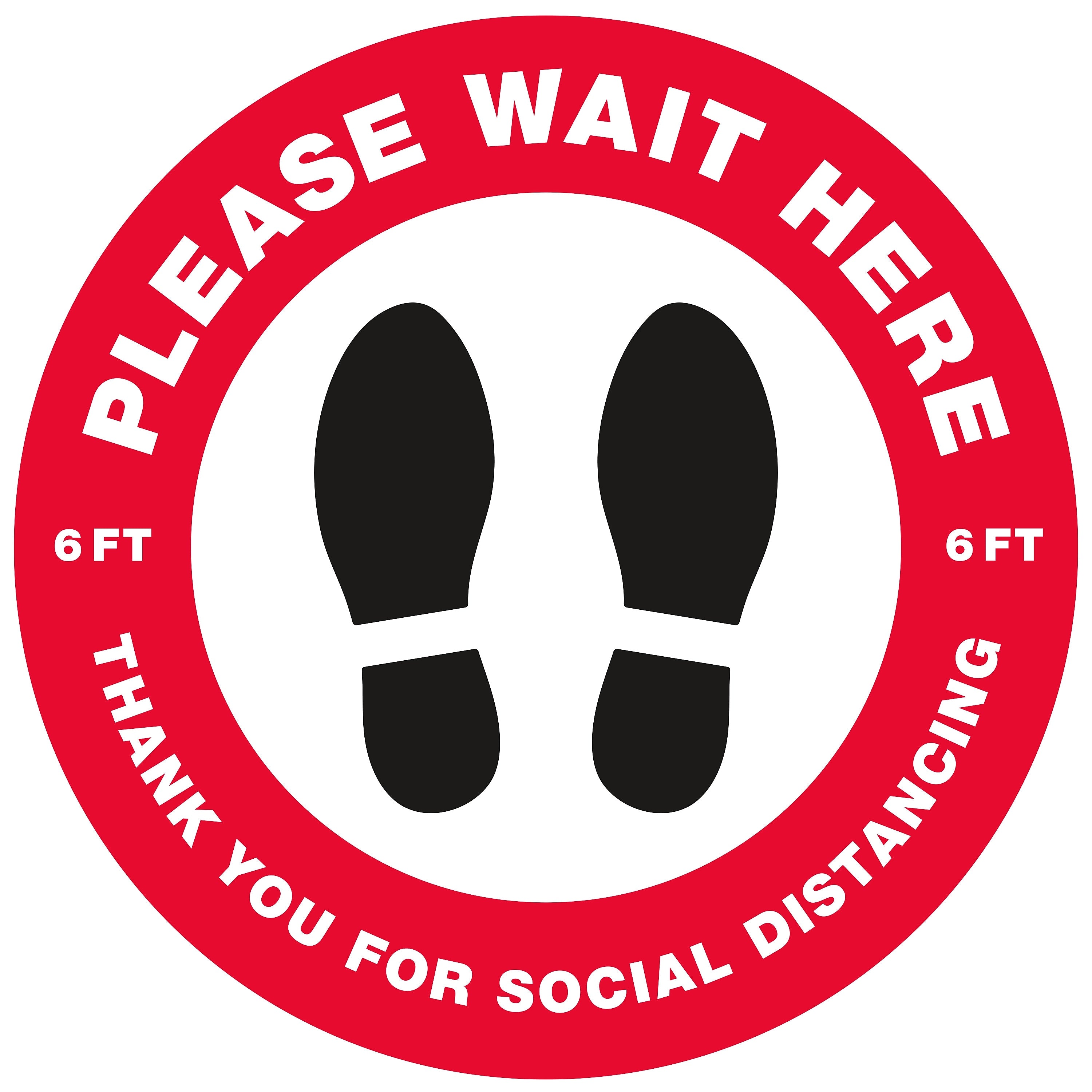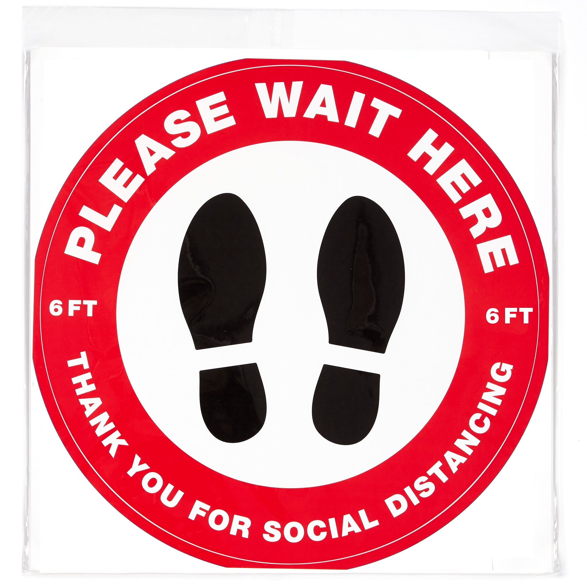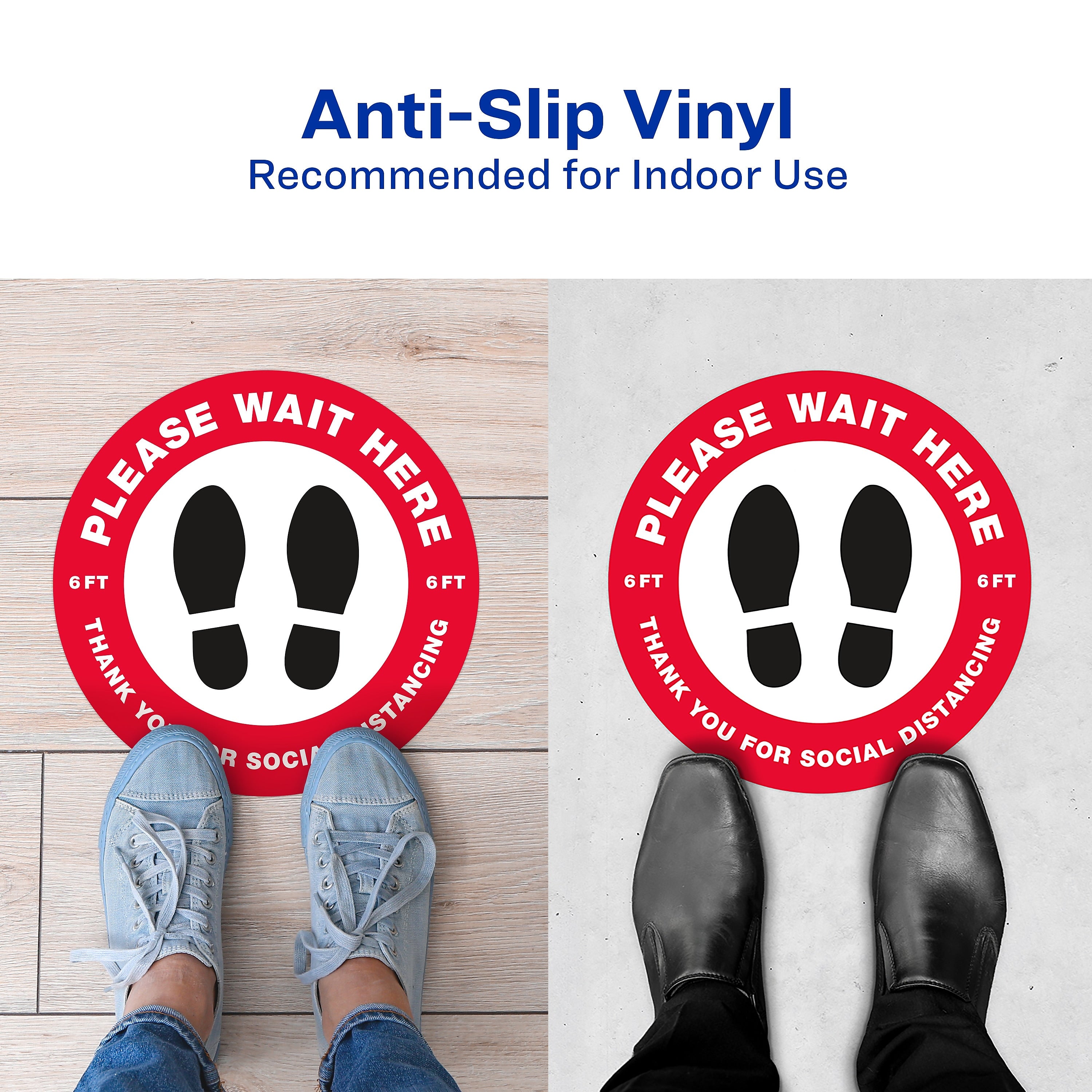 Keep people at a safe distance with round Avery "Please Wait Here" social distancing floor decals. Preprinted with an eye-catching red border and a semi-glossy finish, these large round "Please Wait Here" floor decals have a 10.5" diameter and immediately stand out. Built to withstand the constant wear and tear of everyday foot traffic, these anti-slip vinyl floor decals are scuff resistant, water resistant and UV-coated for additional durability. Removable floor decals stick and stay to multiple indoor surfaces but also peel away cleanly. The removable adhesive also makes it easy to reposition the floor decals so that you can carefully adjust the placement of the vinyl floor decals to make sure that the spacing is just right. Preprinted social distancing floor decals are perfect for every type of location or business including retail stores, restaurants, hair salons, banks, airports and more. Includes 5 preprinted removable vinyl decals.