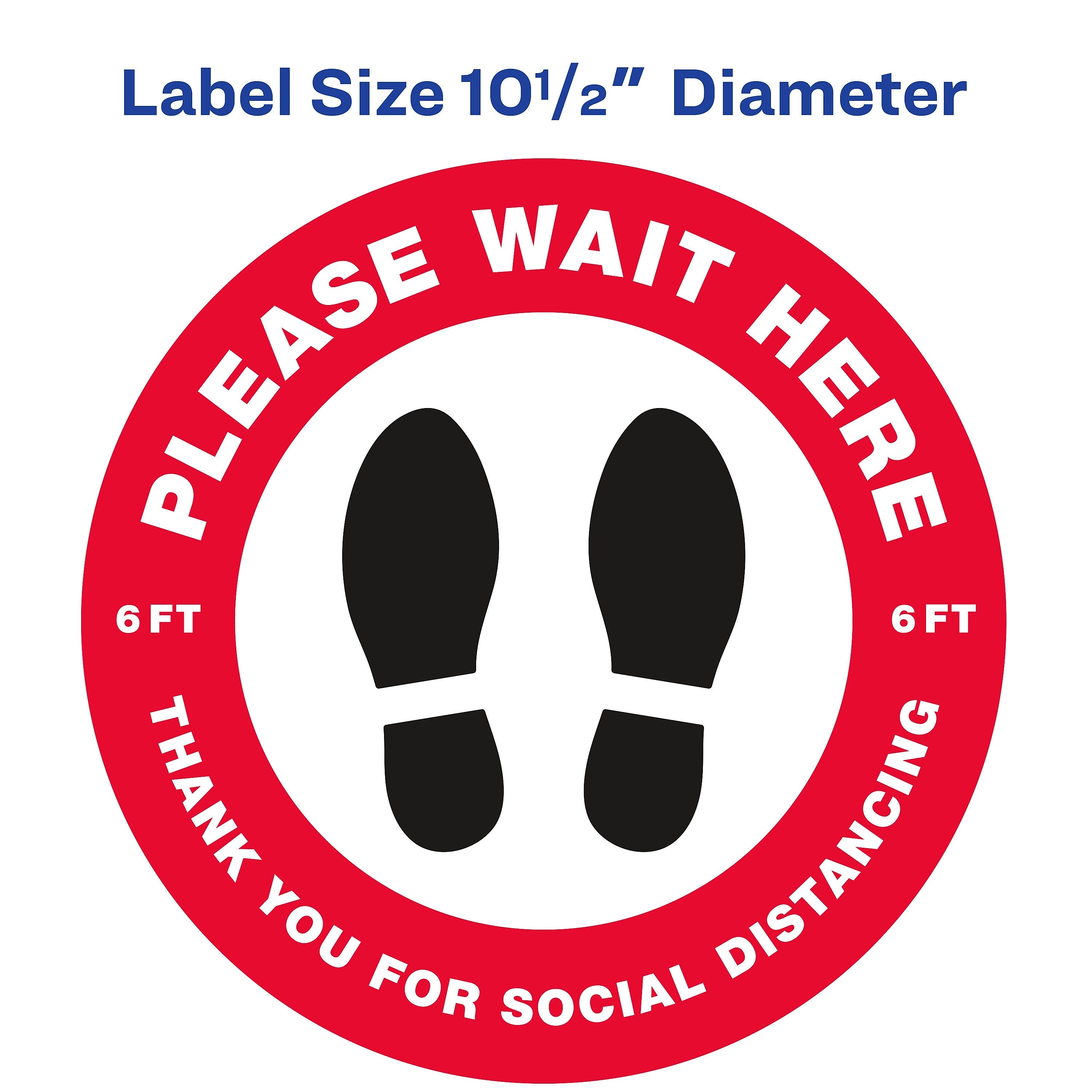 Avery Directional "Please Wait Here" Preprinted Floor Decals, 10.5" Diameter, White/Red, 5/Pack