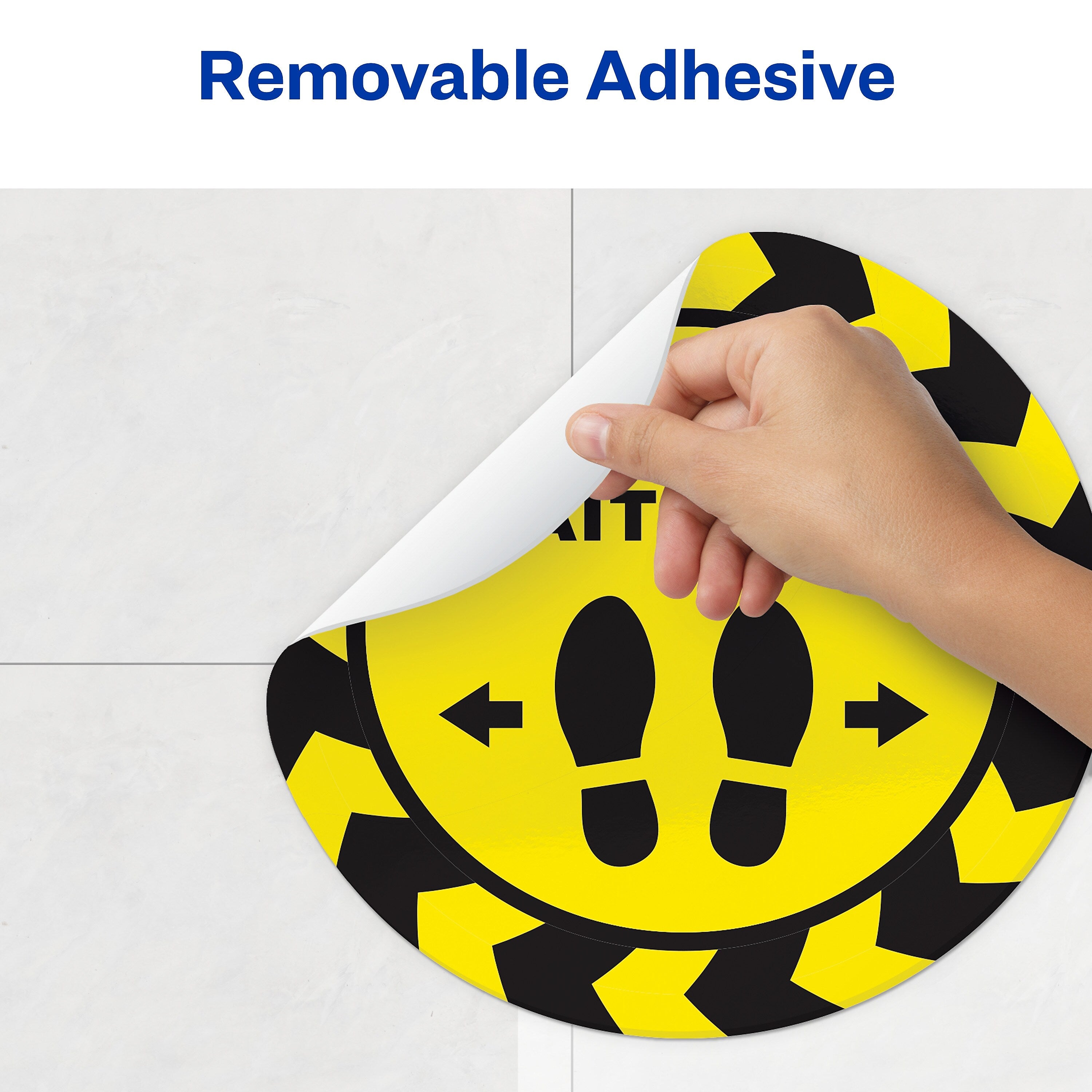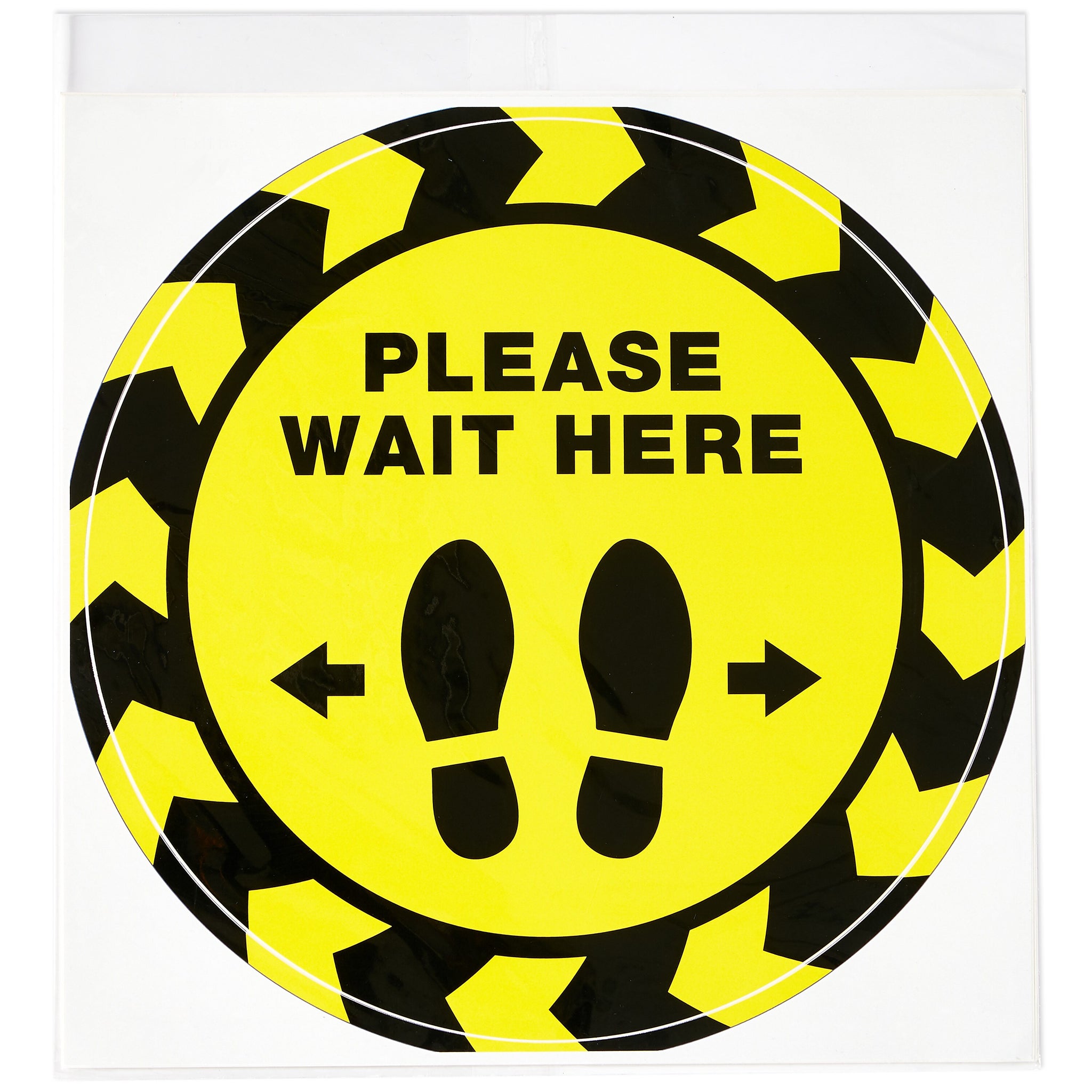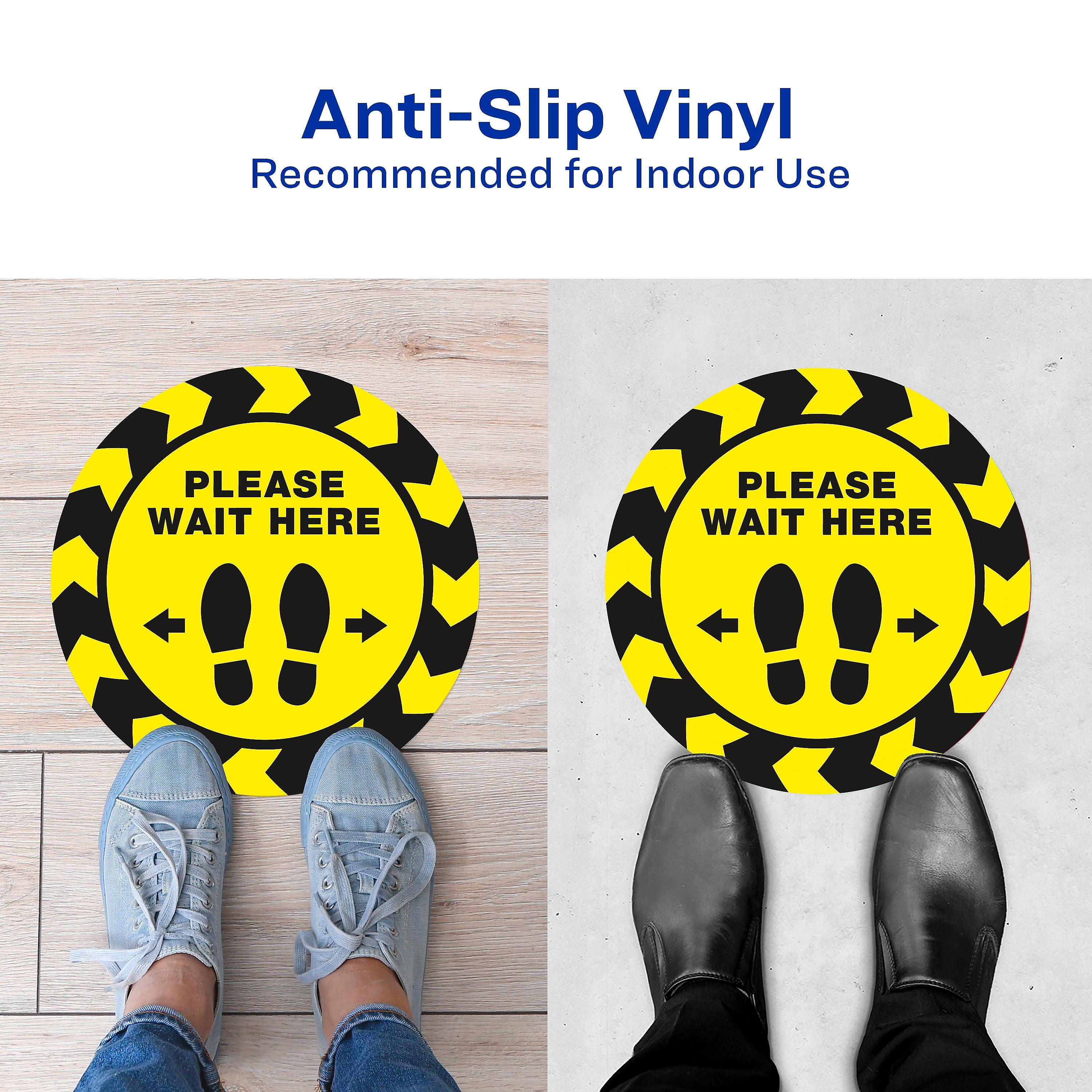 Keep people at a safe distance with round Avery "Please Wait Here" social distancing floor decals. Preprinted with an eye-catching yellow and black pattern and a semi-glossy finish, these large round "Please Wait Here" floor decals have a 10.5" diameter and immediately stand out. Built to withstand the constant wear and tear of everyday foot traffic, these anti-slip vinyl floor decals are scuff resistant, water resistant and UV-coated for additional durability. Removable floor decals stick and stay to multiple indoor surfaces but also peel away cleanly. The removable adhesive also makes it easy to reposition the floor decals so that you can carefully adjust the placement of the vinyl floor decals to make sure that the spacing is just right. Preprinted social distancing floor decals are perfect for every type of location or business including retail stores, restaurants, hair salons, banks, airports and more. Includes 5 preprinted removable vinyl decals.
