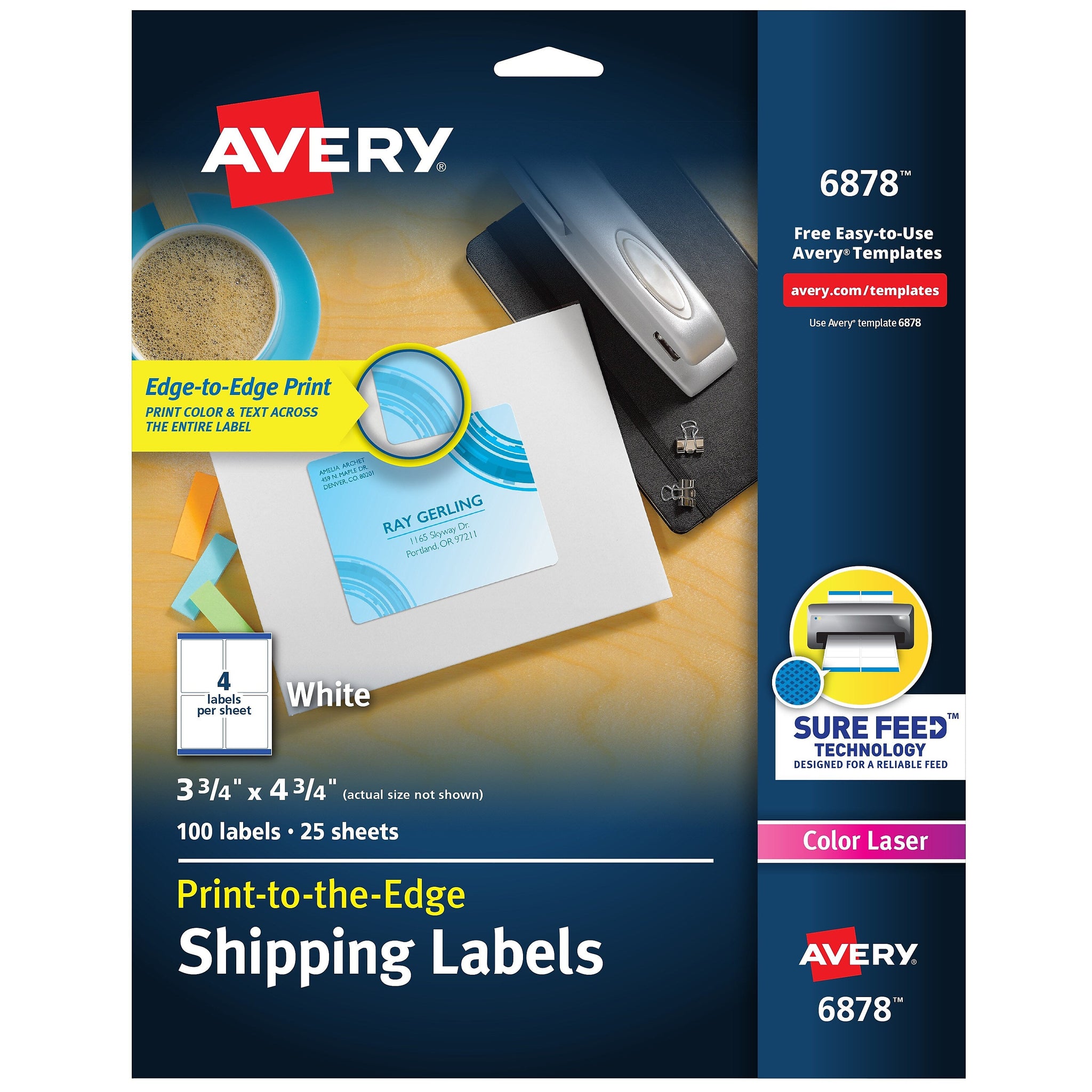 Create eye-capturing, printable labels for your mail or project with Avery Shipping Labels for Color Laser Printers. Create beautiful customizable sticker labels with full-bleed backgrounds as the print-to-the-edge feature allows you to print vivid color and sharp text beyond the cutting edge. Now you can create fully customizable labels without any margin, borders, or excess white space. To ensure a reliable feed through your printer, Avery Sure Feed technology helps prevent misalignments and paper jams. Easily customize the blank labels with the thousands of free designs, templates, and mail merge tools found at avery.com/template. Use the quarter-page rectangle labels to create box labels, shipping labels, party favor labels, large envelope labels, and more. The personal shipping labels are guaranteed to stick and stay with the permanent adhesive feature. Sized at 3-3/4" x 4-3/4", the pack includes 100 labels. For the environmentally conscious advocate, the paper is FSC certified. The labels are optimized for color laser printers.