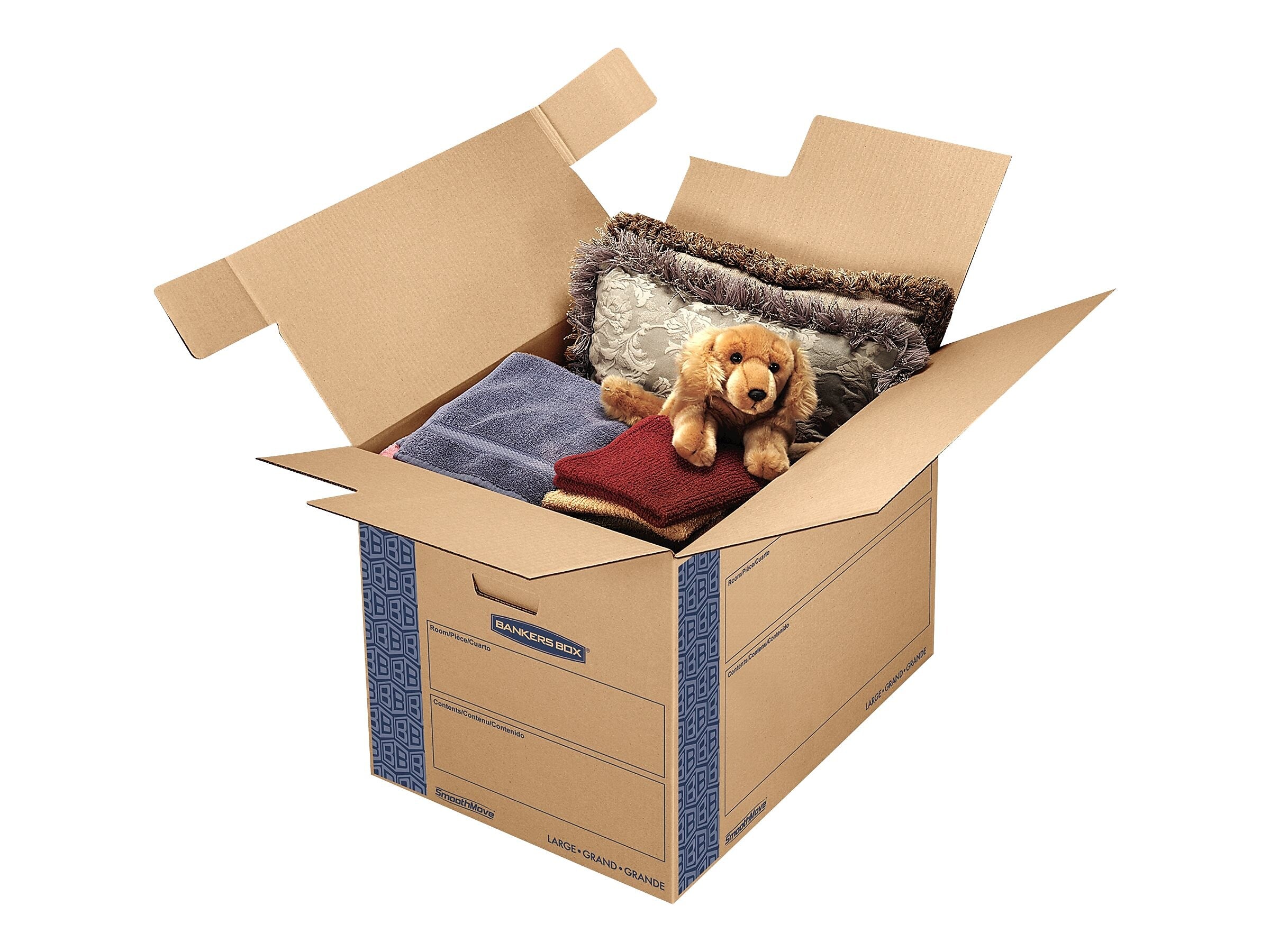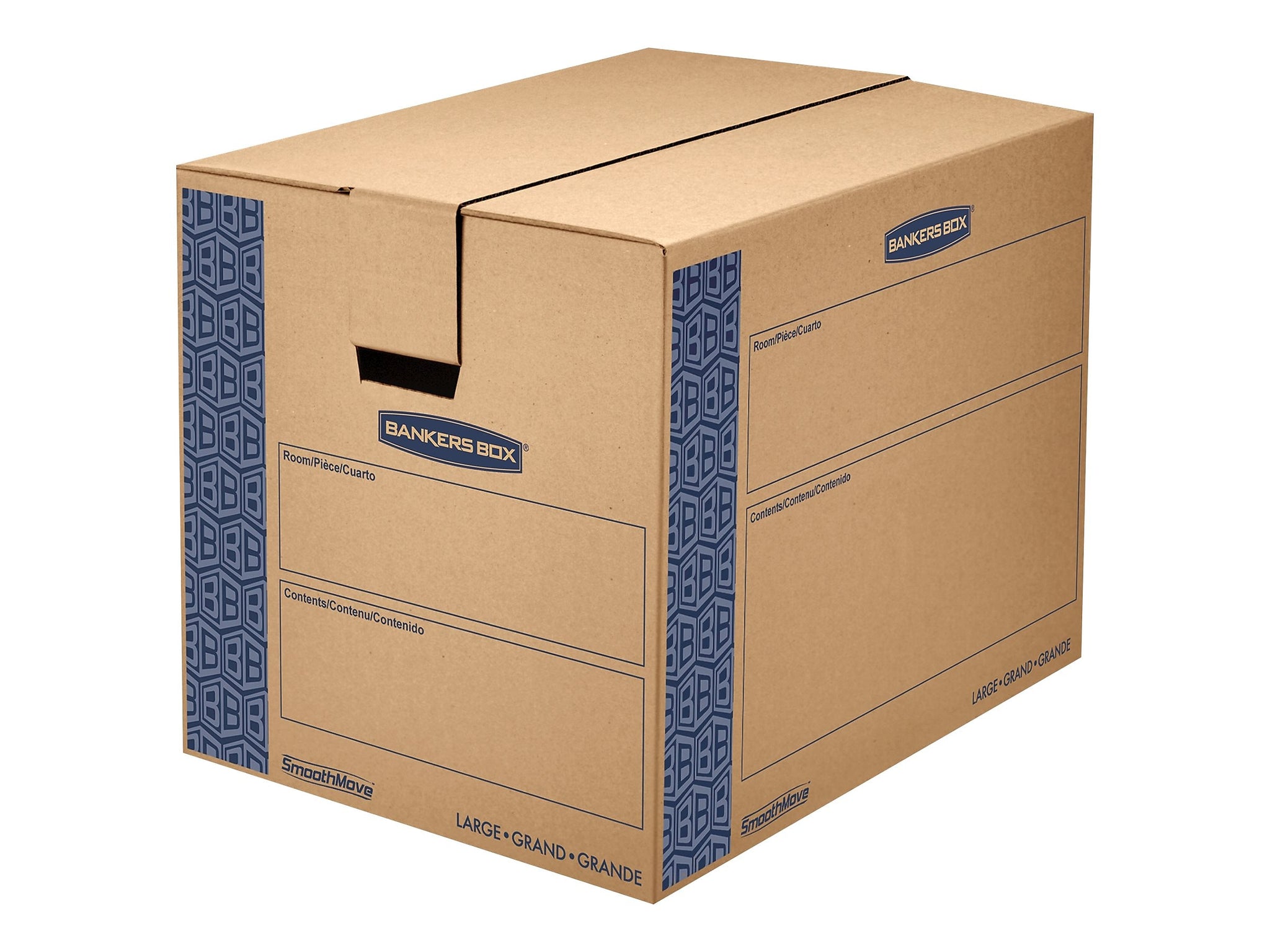 Pack supplies, equipment and office essentials with these large moving boxes. The locking lids require no tape to stay closed, and the simple design allows for fast, easy assembly. Each of these Bankers Box SmoothMove moving boxes features a blank form, making it easy to add a list of contents stored inside.
