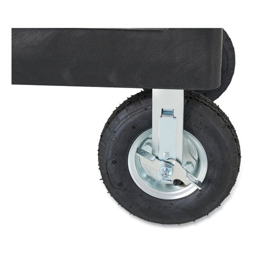 Handy, durable utility cart features rust-, dent-, chip- and peel-proof structural foam construction. Ergonomically designed push handle provides optimum hand placement and push height improving control and worker safety. Molded-in storage compartments, holsters, hooks and notches. Rounded corners and shelf walls won't damage furniture and walls. Variable grip-height handle improves control and worker safety. Built-in tool holster and molded-in fittings allow for easy addition of pipes or rods. 500 lb capacity.