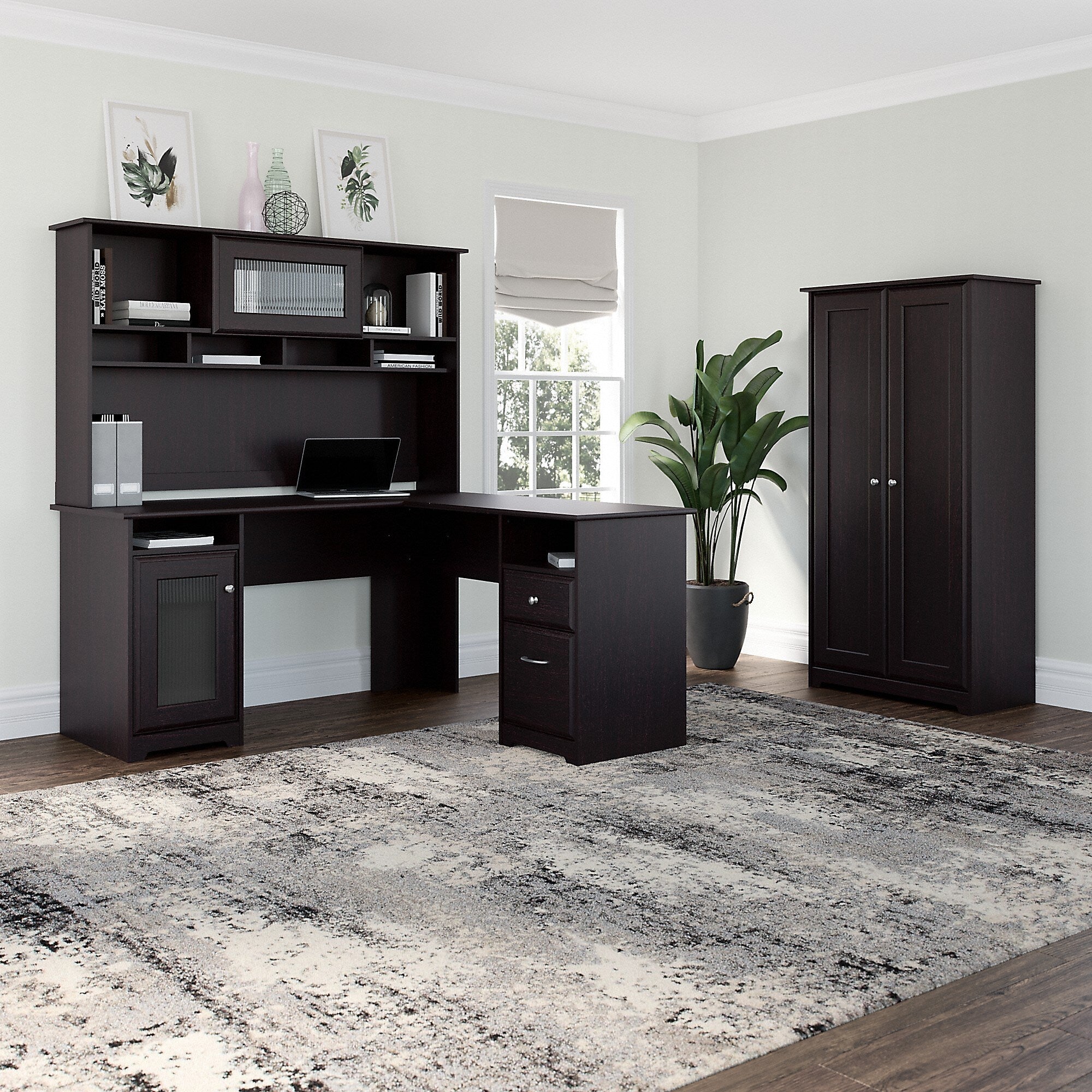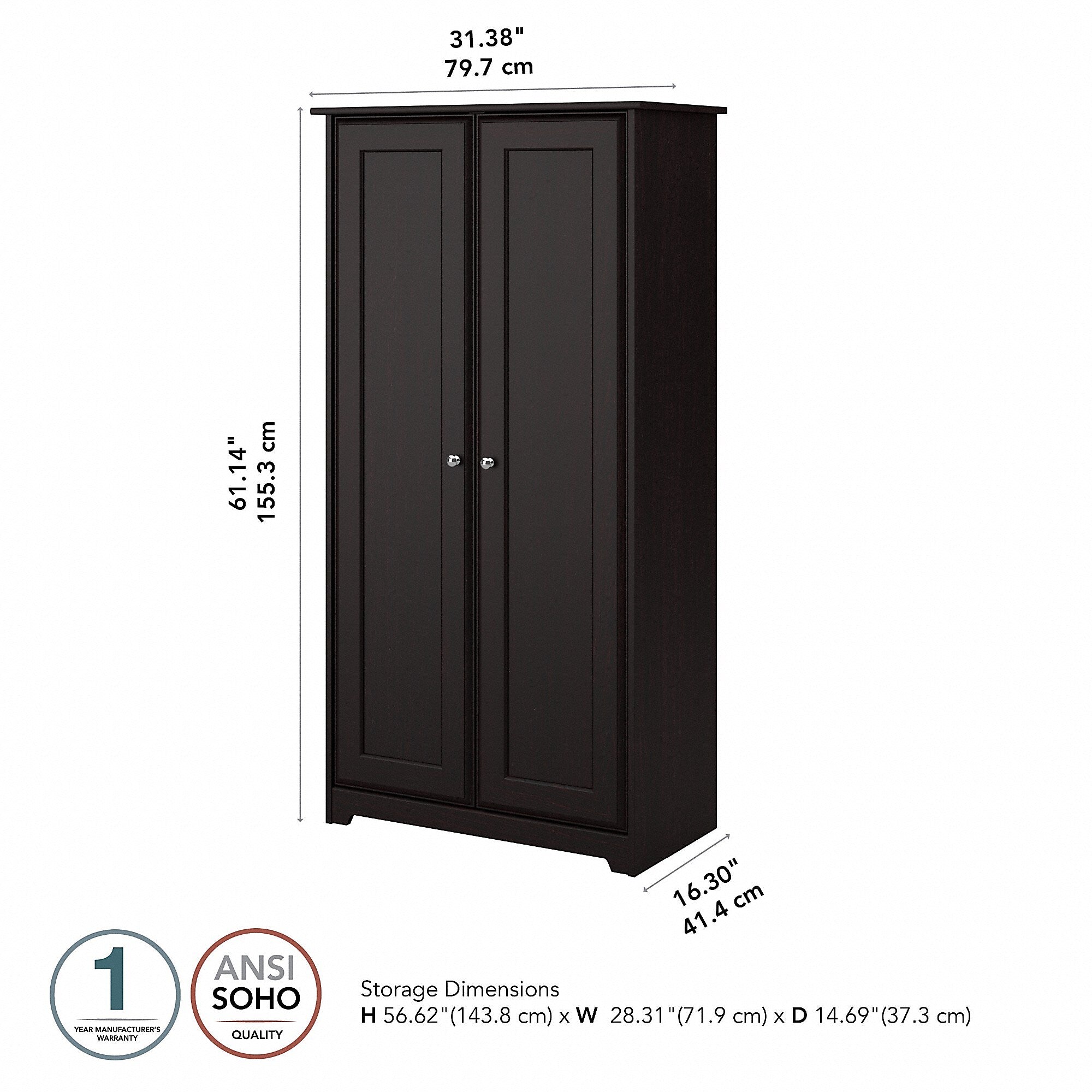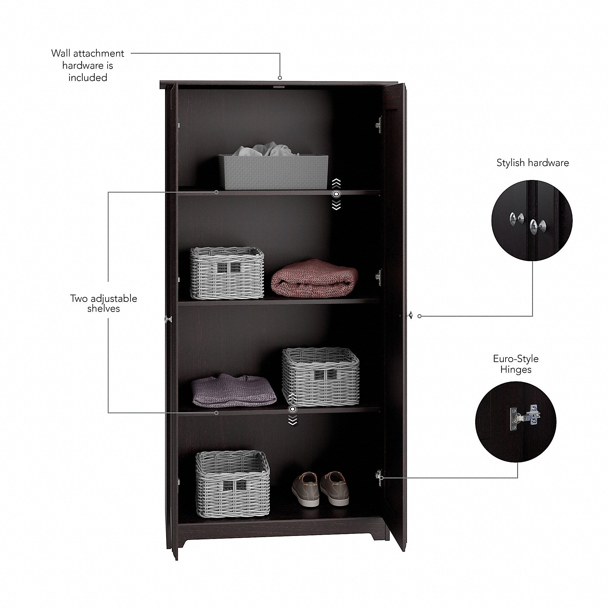 The Bush Furniture Cabot Tall Storage Cabinet with Doors offers a convenient way to keep books, personal items and supplies organized in any home office or living space. Two cabinet doors with smooth Euro-style hinges open to reveal two fixed shelves and two adjustable shelves for the flexibility to store materials of various sizes. Each shelf supports up to 50 pounds, so organizing bulky items like hardcover books, binders and photo albums is no problem. The tall accent cabinet works well as a standalone storage solution or as part of a larger home office furniture set, and it comes with wall attachment hardware for family-friendly safety and security in any environment. This 2 Door Storage Cabinet is tested to meet ANSI/SOHO standards for safety and performance and is backed by the Bush Furniture 1 Year Manufacturer's Warranty. See the full collection for coordinating items available.