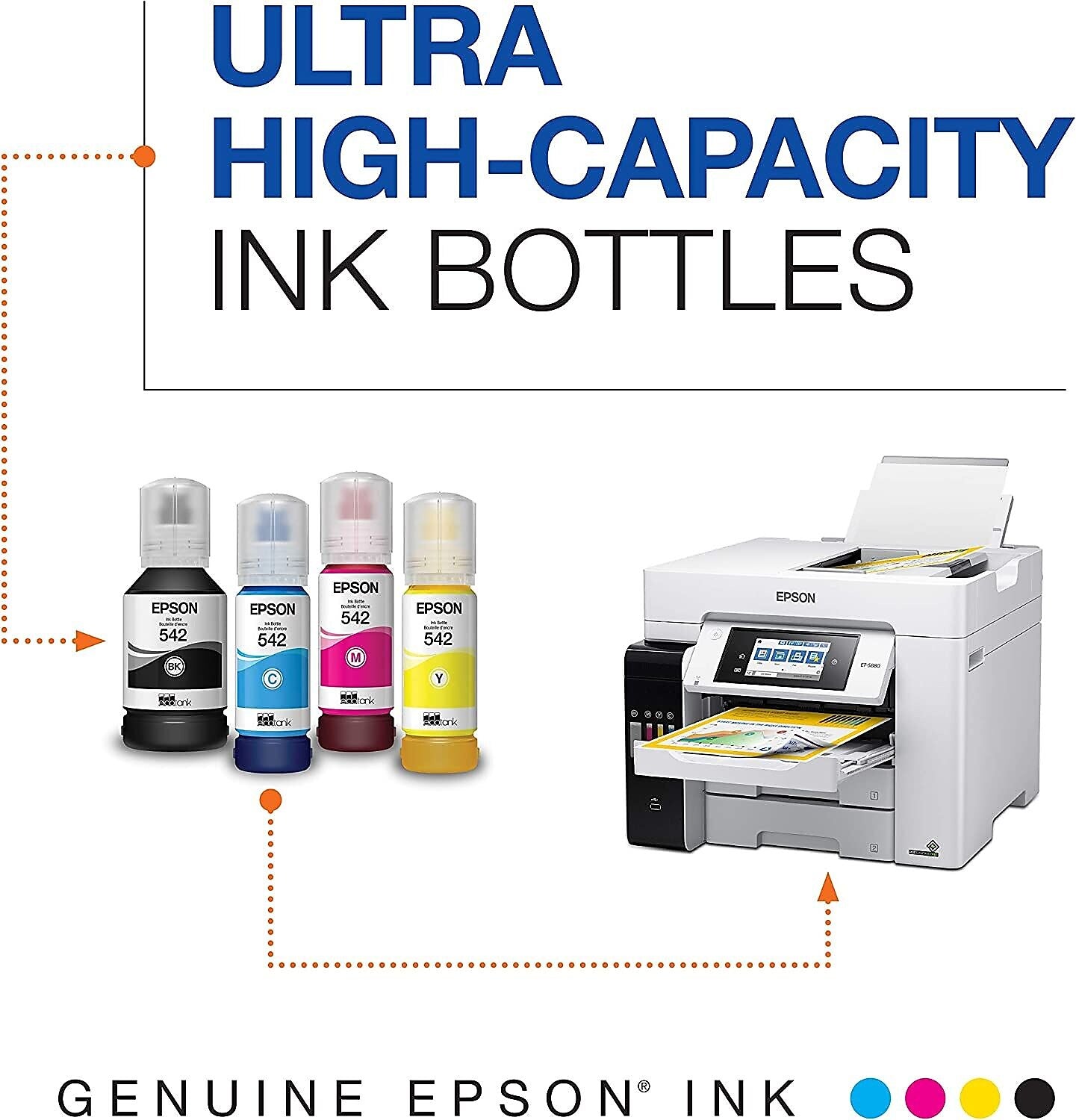 Epson EcoTank pigment ink delivers sharp text, bright colors and professional-quality results. EcoFit replacement ink bottles mean you get thousands of vivid pages. Exclusive uniquely-keyed EcoFit bottles make it easy to fill each color tank.