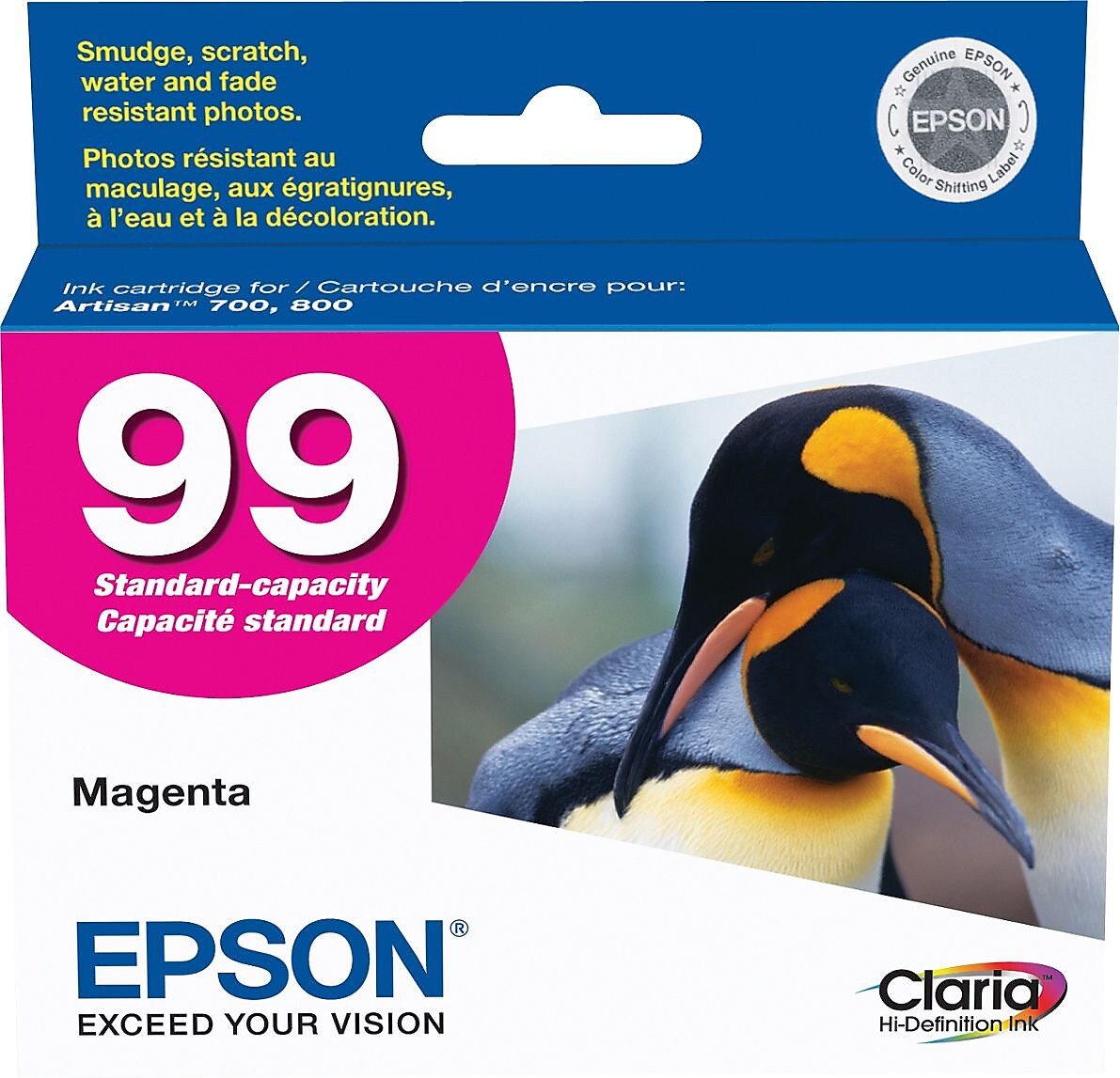 Protect prints from smearing and streaks with this magenta ink cartridge. The standard-yield format lets you tackle everyday printing tasks, while the magenta ink brings vibrant color to every printout. This Epson 99 ink cartridge is compatible with select Epson all-in-one machines and is simple to install, so you can get printing tasks going right away.