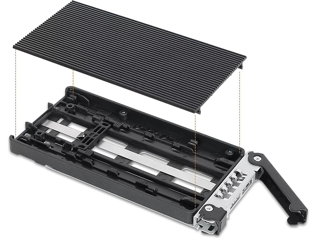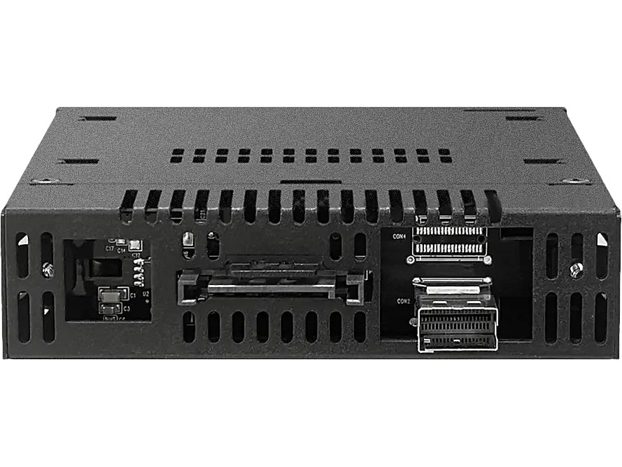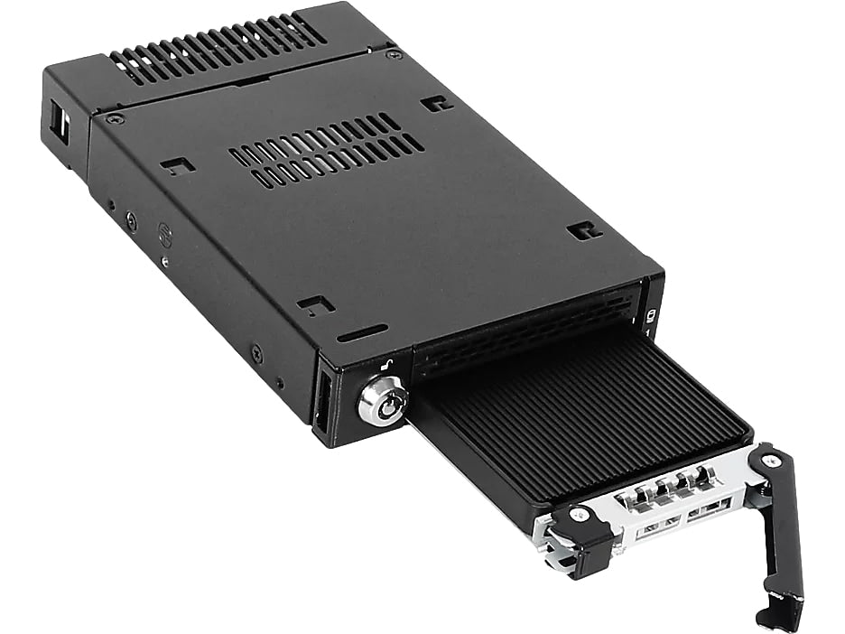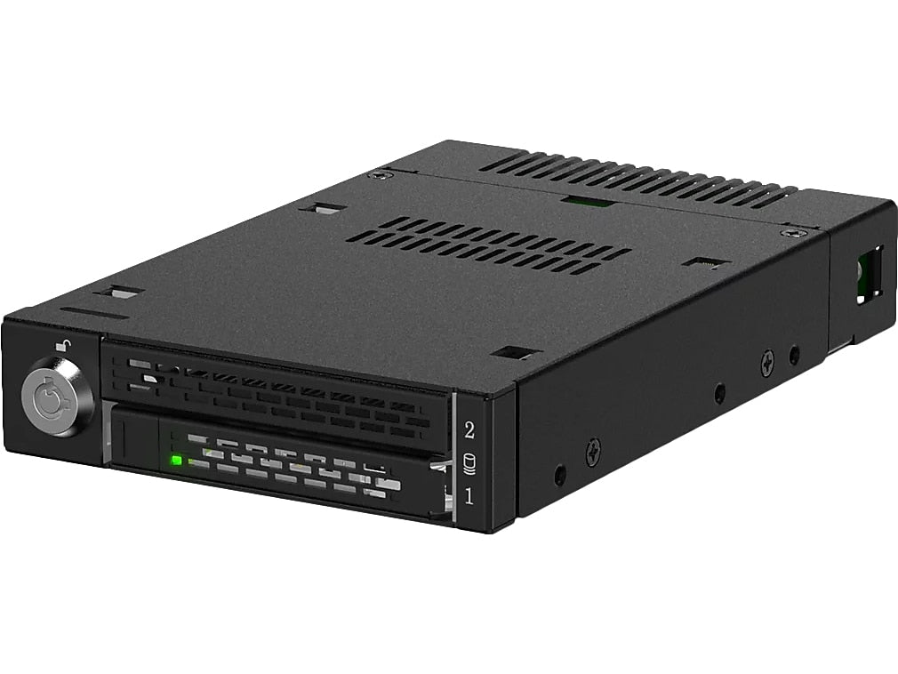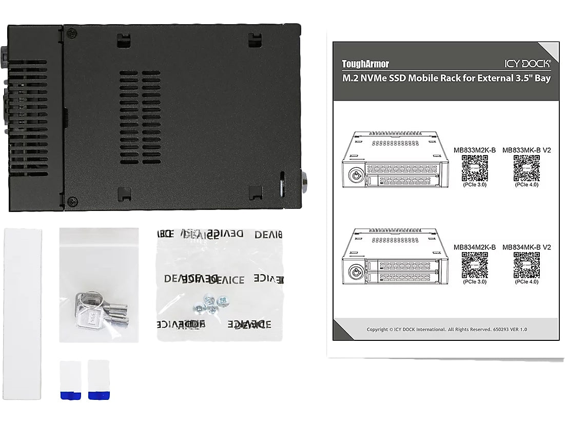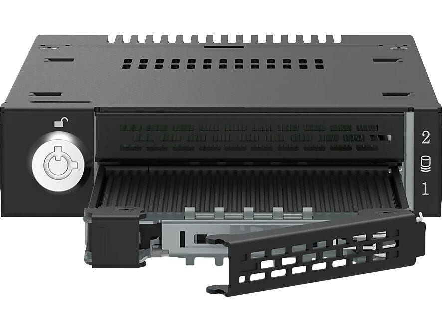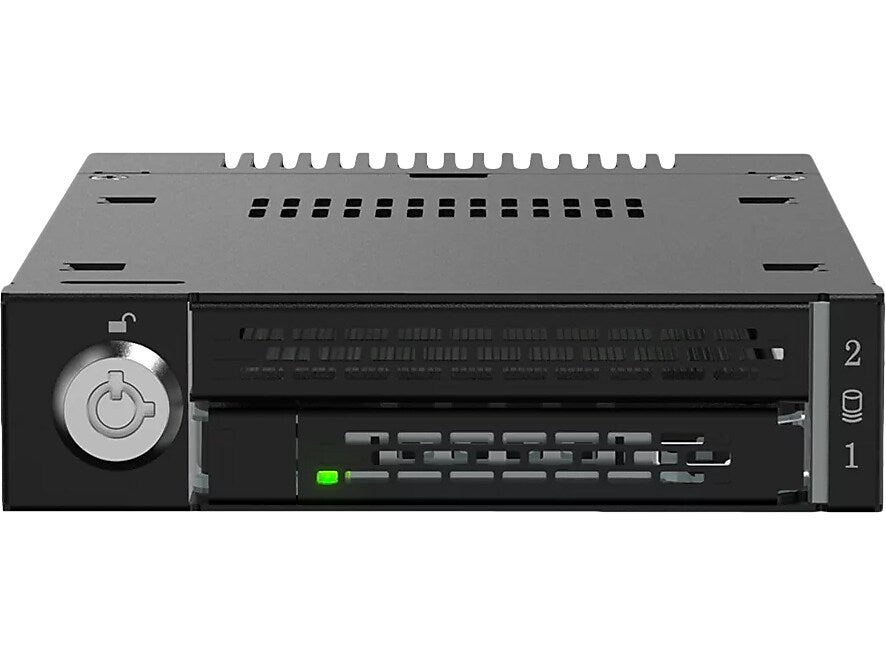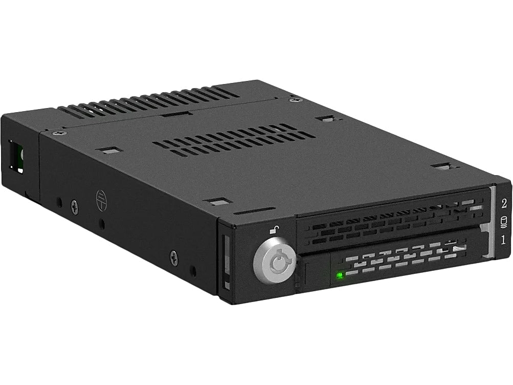The ToughArmor MB833MK-B V2 is a ruggedized removable M.2 NVMe SSD enclosure that fits a single external 3.5" drive bay of the computer system and supporting PCIe 4.0 64Gb/s data transfer rates via SlimSAS 4i (SFF-8654) interface and accepts all standard M.2 drives lengths from 30mm to 110mm (2230, 2242, 2260, 2280, 22110). It simplifies the process of installing or removing M.2 NVMe SSD by using the removable drive trays with tool-less adjustable M.2 drive locker, making it easy to change drives at any time without open the computer case or dealing with drive mounting screws. In addition, while working together with numbers of ventilation holes around the enclosure, each drive tray is equipped with a high efficiency aluminum heat sink to ensure your SSDs are at optimal temperatures. As part of ICY DOCK's toughest line, the MB833MK-B V2 is made out of full metal construction with metal barrel key locks for maximum protection.