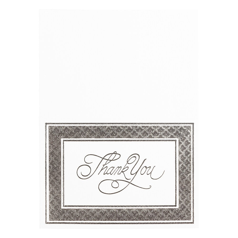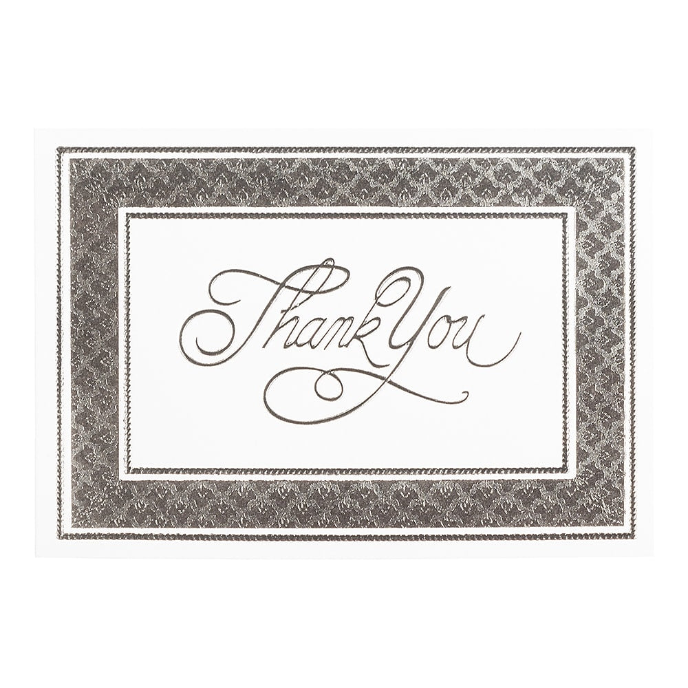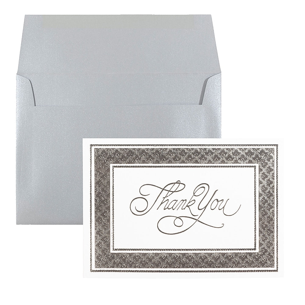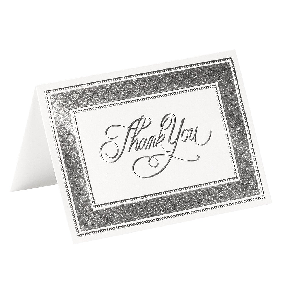 Spruce up your stationery by purchasing JAM Paper® Silver Border Thank You Cards with Silver Stardream Envelopes! These cards are a great way for you to show your appreciation for friends and family. Whether you want to thank guests for taking part in your party, or co-workers for their congratulations on your promotion, you can't go wrong sending them all a thoughtful handwritten card! Each one of these cards measures 4 7/8" x 3 3/8", and contains an intricate silver border on the front. It also has 'Thank You' in silver script, and a blank interior! This set holds 25 cards, which are made from high quality 65lb paper, and 25 matching envelopes.Size: 4.875in x 3.375in| Color: Silver Border Cards; Silver Stardream Envelopes| Quantity: 25