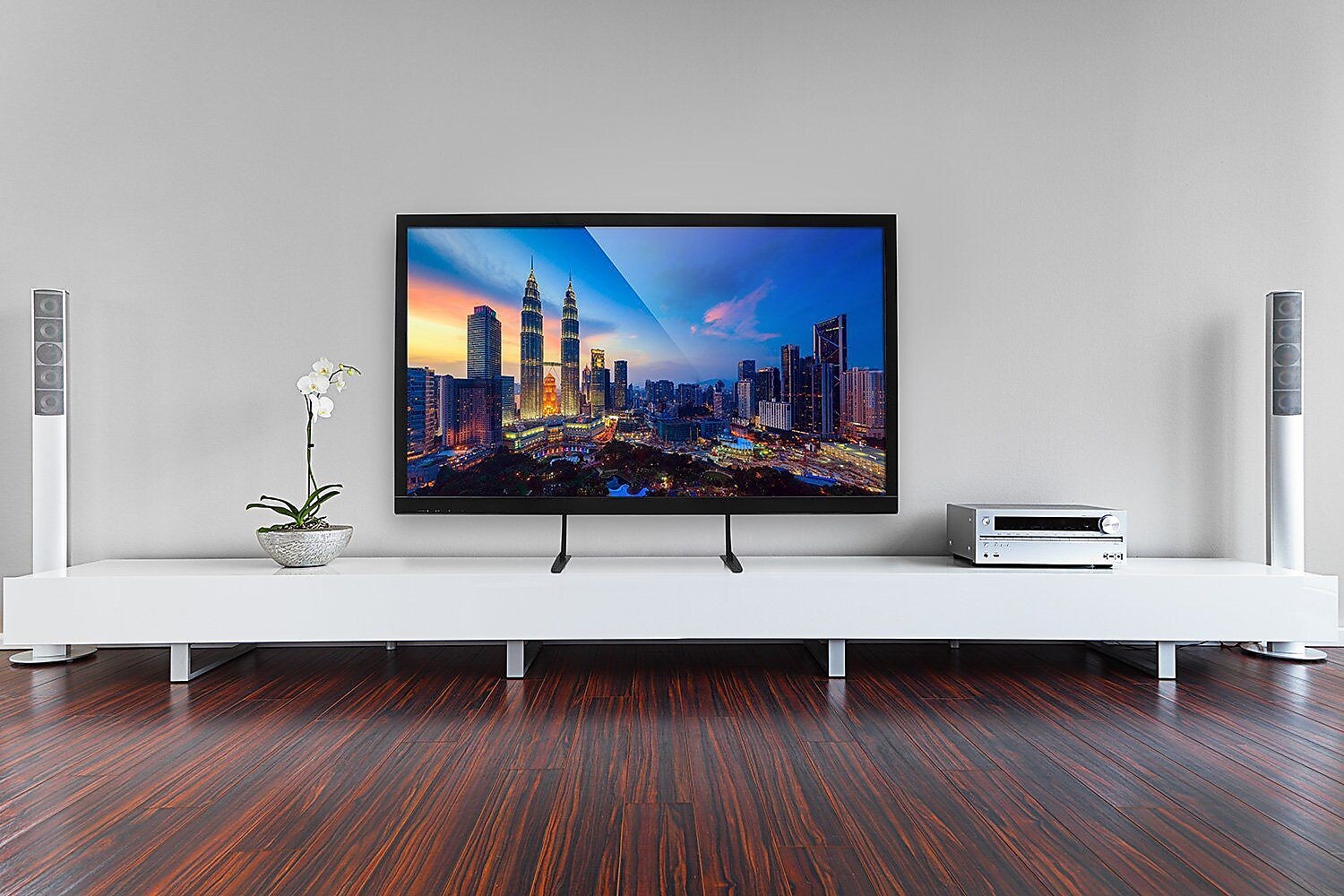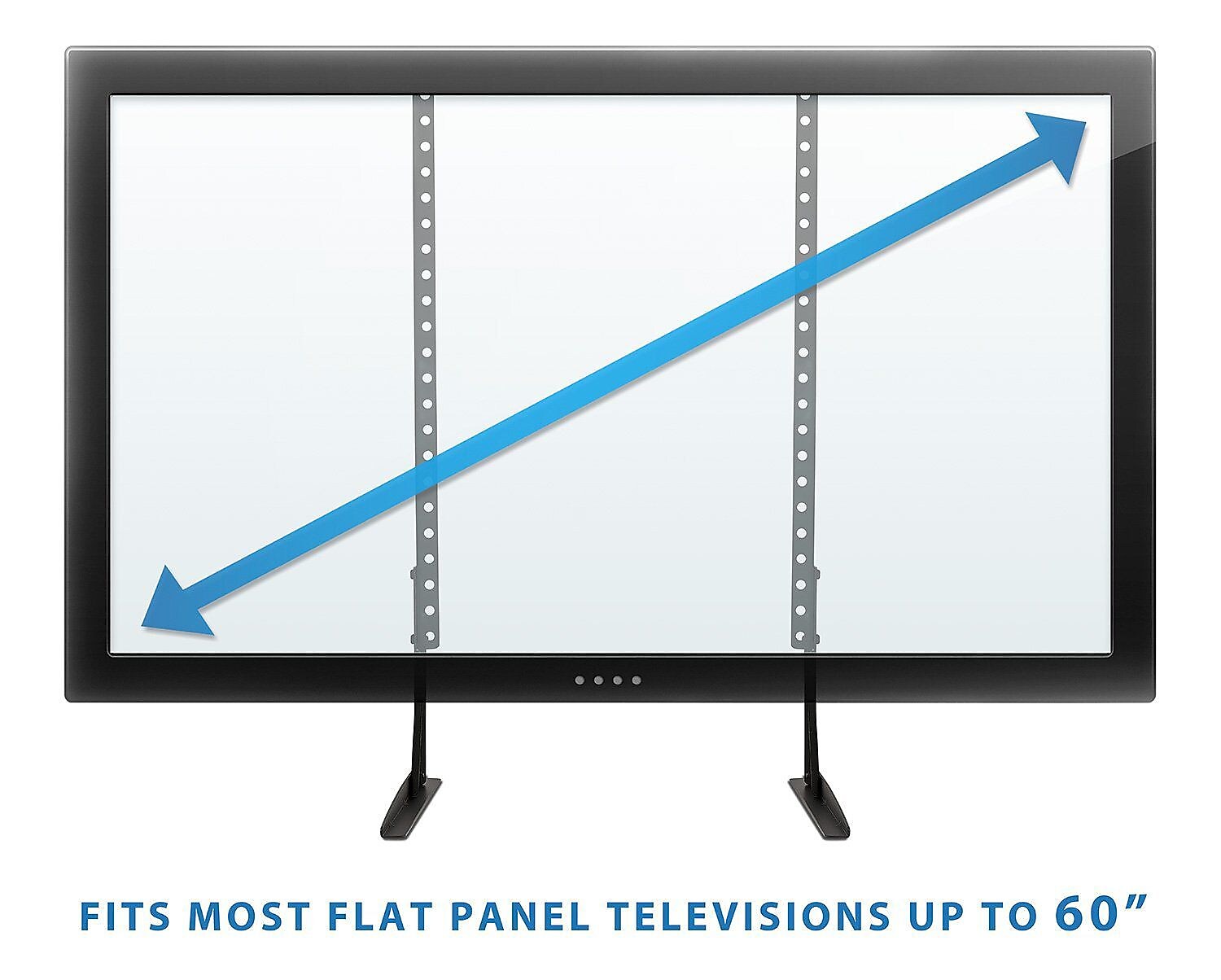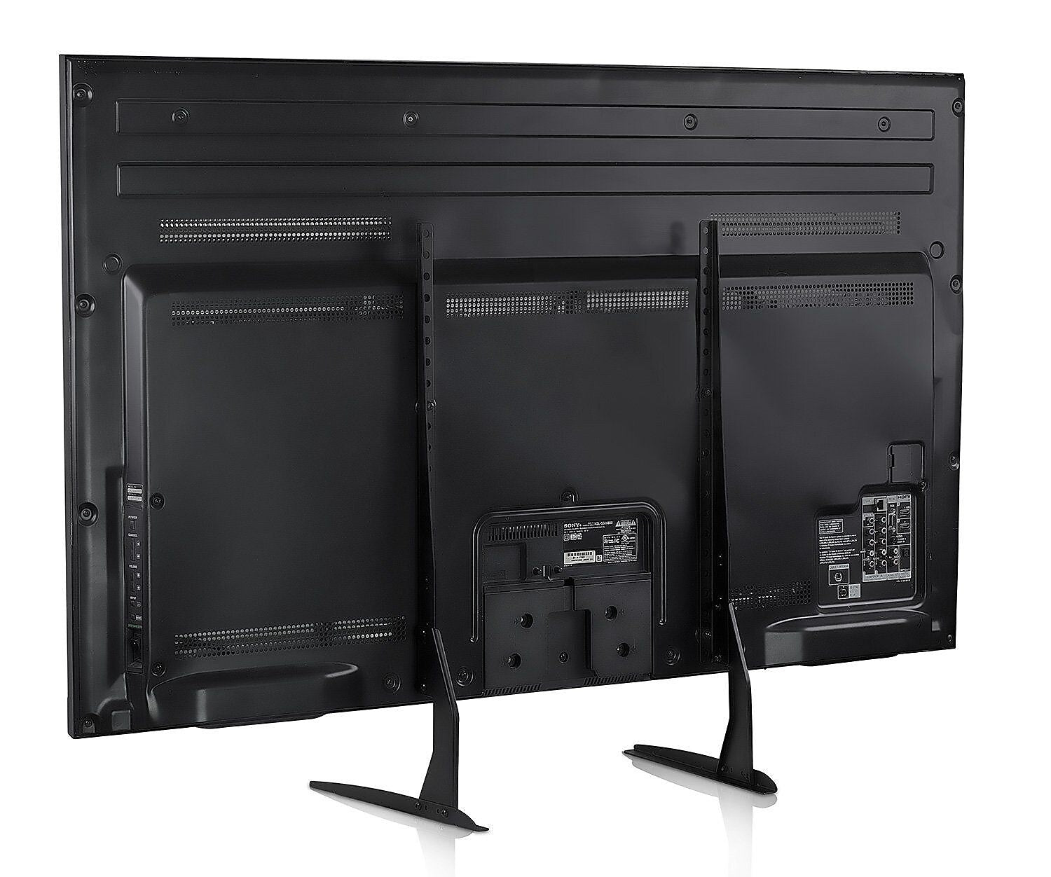 Mount-It! universal TV pedestal is the ideal stand for your flat panel TV. It easily connects to the bolt holes behind your TV for a durable and sleek table top installation. With height adjustability and durable sleek design, it is an ideal TV stand solution for your flat panel TV. Heavy-duty steel can carry up to 110 lbs. of load, perfect for even the largest plasma televisions. The extended base ensures high level of stability. Multiple installation holes and two levels of base height adjustment allows you to achieve the perfect TV height.