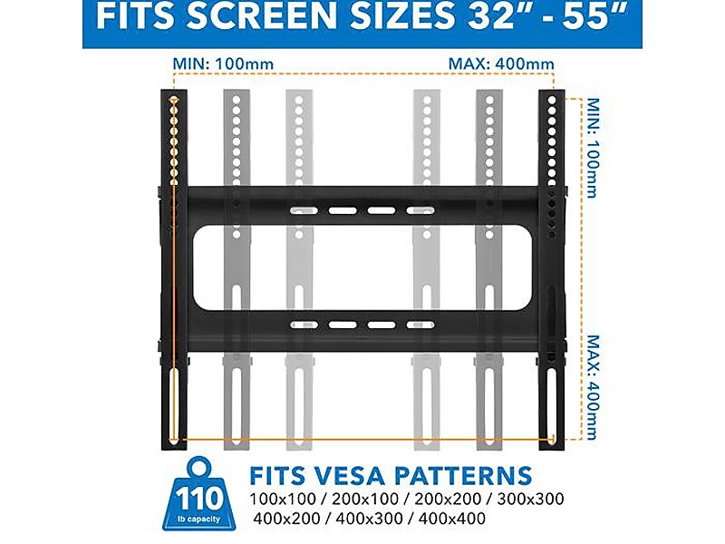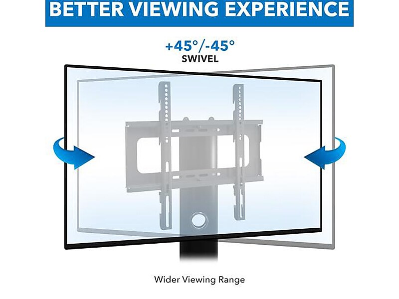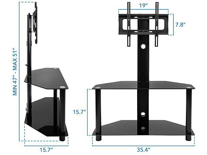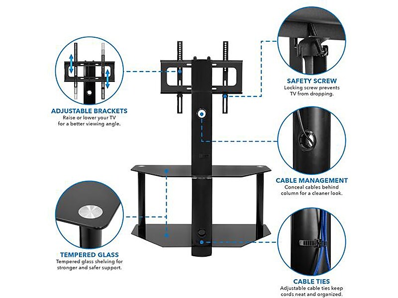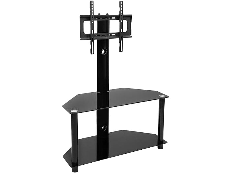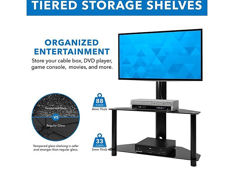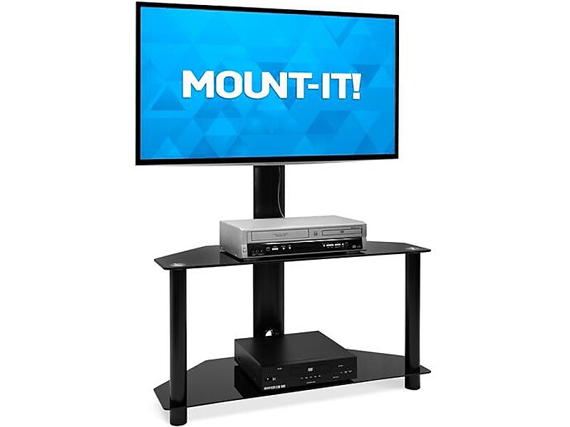 The Mount-It! MI-1860 TV mount and shelving unit is height-adjustable and creates a spacious area for organizing your media equipment. The black silk screen and spacious shelving design is built for a contemporary appearance. Open-shelf design maximizes airflow and keeps your AV equipment running at safe temperatures. This shelf-mount stand combination allows you to achieve a smooth look without requiring invasive drilling or wall marring. Cable management is ready for bundling and organizing your cords neatly behind the stand with the included clip.