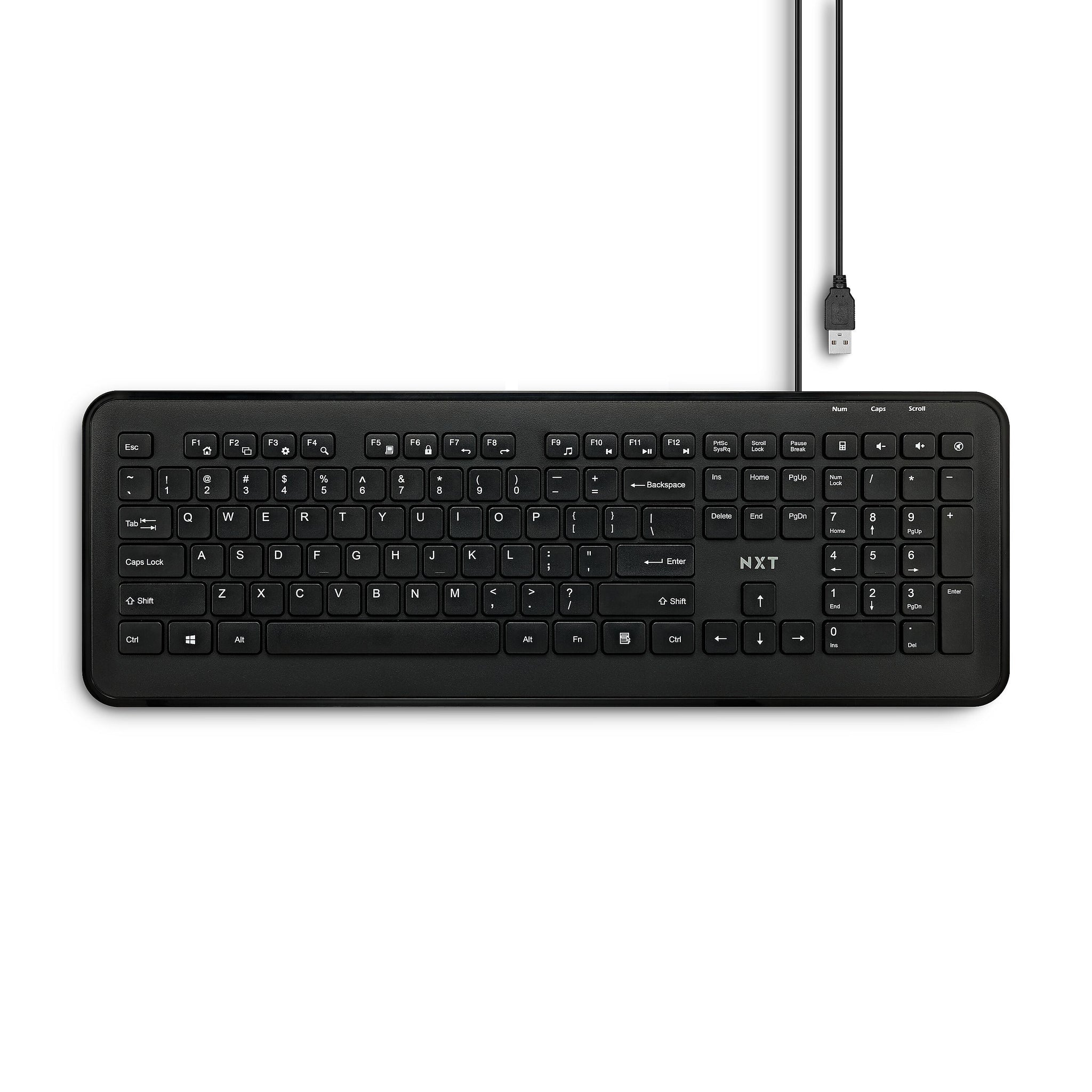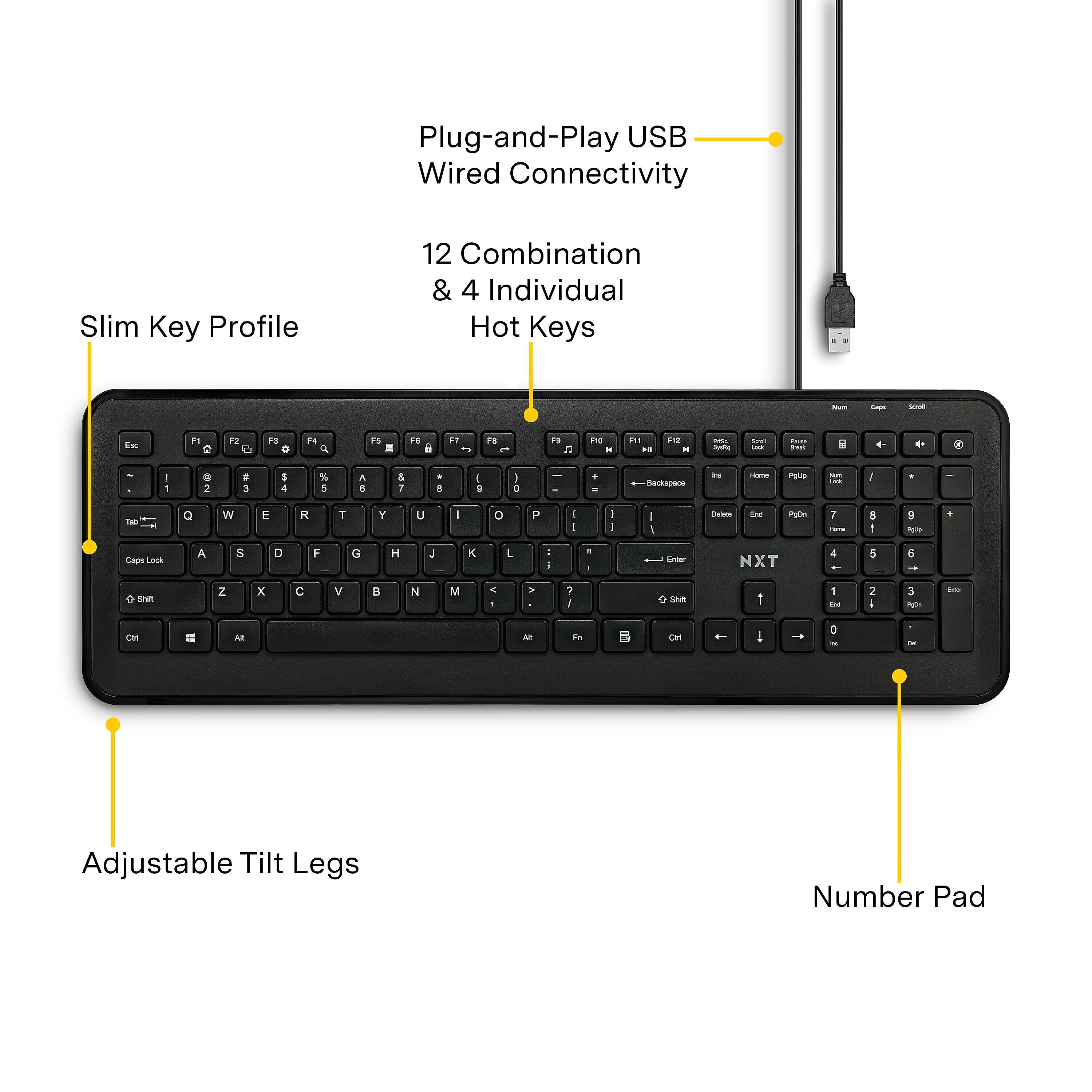 Improve productivity at home or at work with this compact wired keyboard. A slim profile makes the most of your desktop space, while the adjustable-tilt legs let you position your keyboard for optimal comfort. The plug-and-play USB connectivity and compatibility with Windows and macOS enables quick setup. This NXT Technologies™ wired keyboard features 12 hot keys for fast access to frequently used functions and a number pad for easy numeric data entry.