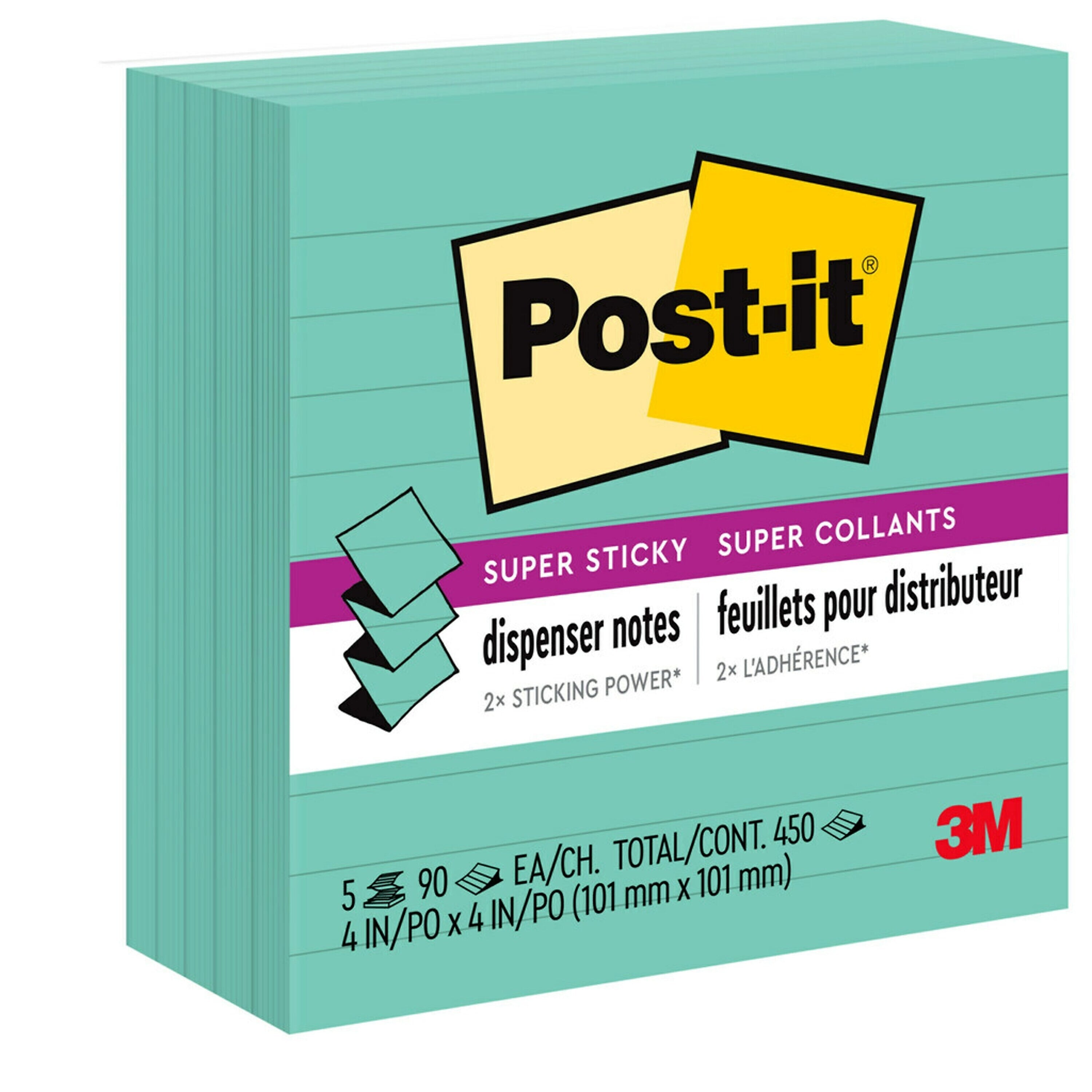 Post-it® Super Sticky Pop-up Notes in 4 in x 4 in feature 2x the sticking power. Specially designed accordion-style notes work in Post-it® Pop-up Note dispensers, and are great for lists or longer notes on doors, windows or walls. Unique adhesive reliably sticks and re-sticks so your message can stay front and center. Move your to-dos with you throughout the day. Aqua Wave color helps your list stay visible. 5 Pads/Pack, 90 Sheets/Pad.