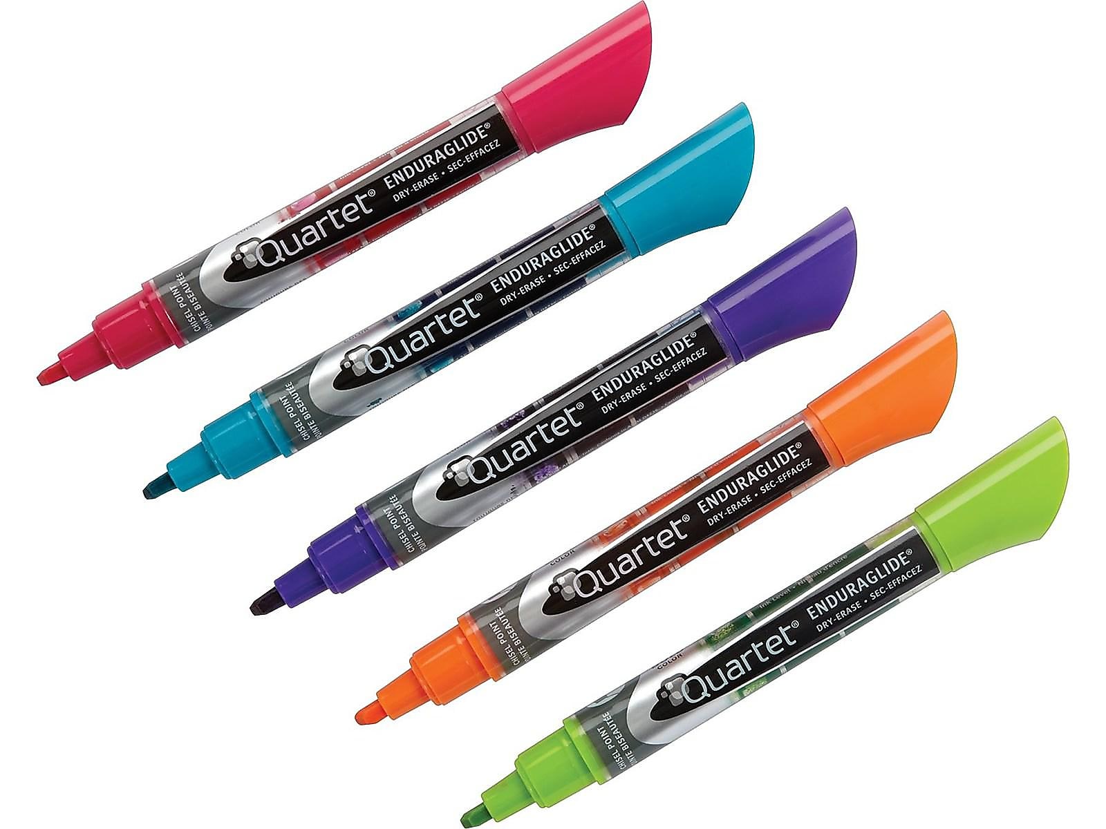 Color-code project instructions, upcoming events, and other notes with these assorted-ink markers. The dry-erase design makes it easy to add and take away writing, while the chisel tip can produce both bold and thin lines, offering strong versatility. These Quartet EnduraGlide markers are non-toxic and come with a cap that prevents rolling, keeping them in place for easy access.