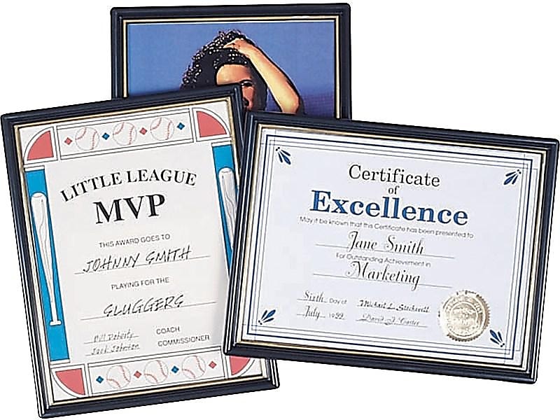 Give documents and photos a professional look with these all-purpose frames. The black color and gold trim offer an upscale look, while the sturdy plastic construction offers long-lasting durability. Each frame comes perfectly sized to hold standard letter-size sheets, so you can display portrait-size photos and a wide array of other items. With a handy three-count package, these Staples black frames make it easy to dress up a wall in your home or office.