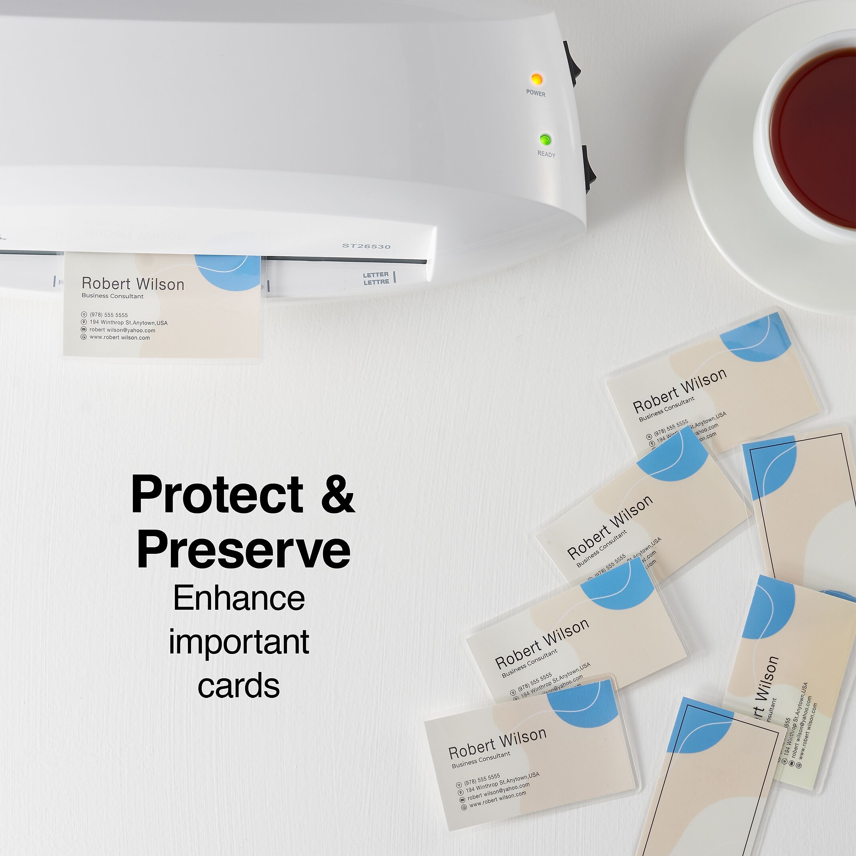 Reinforce business cards or ID badges with these Staples hot laminating pouches. Clear construction and a glossy finish ensure each card remains easy to read, while the simple format works with a wide range of thermal laminating machines for convenient compatibility. With thick, durable construction, these Staples hot laminating pouches stand up to everyday wear and tear for long-lasting use.