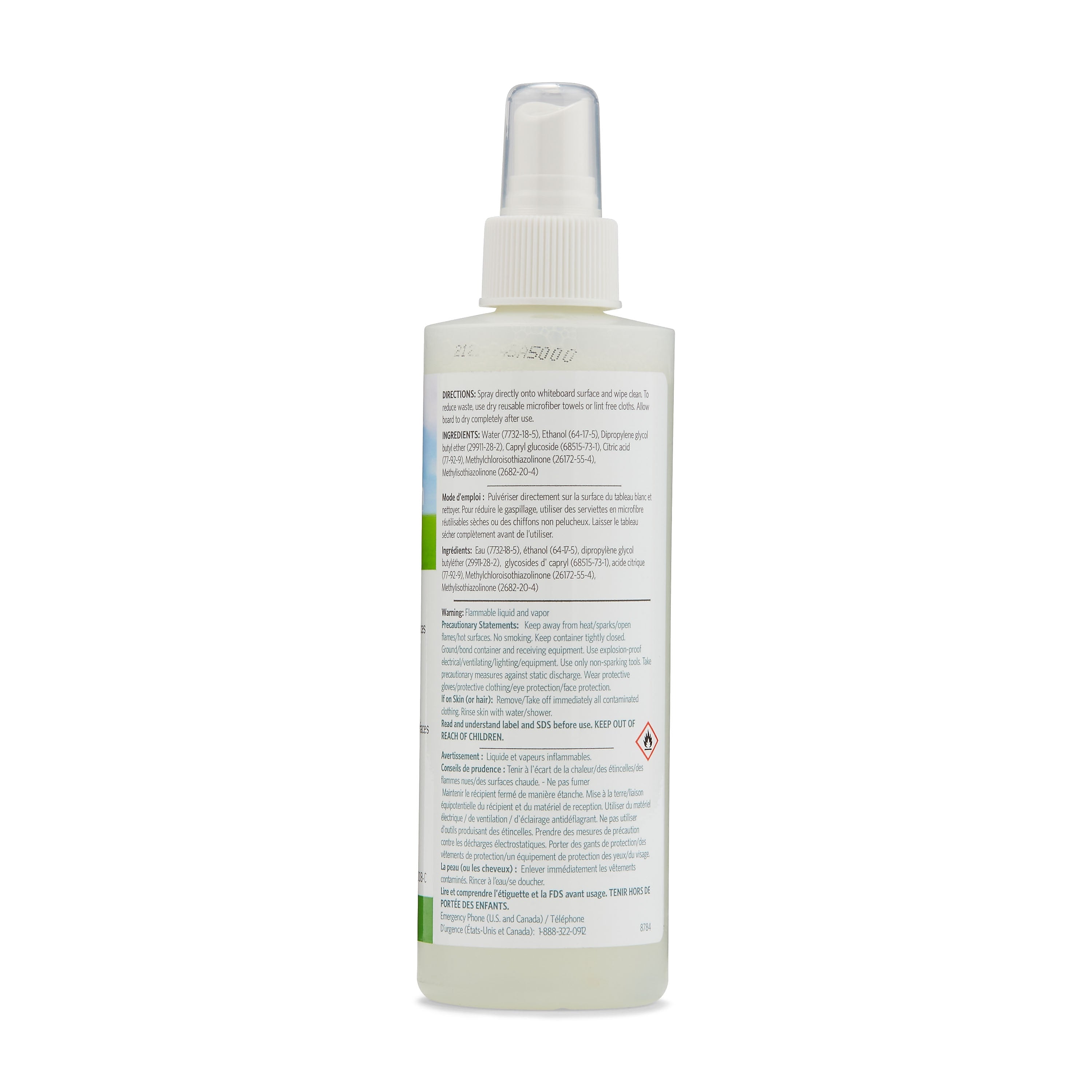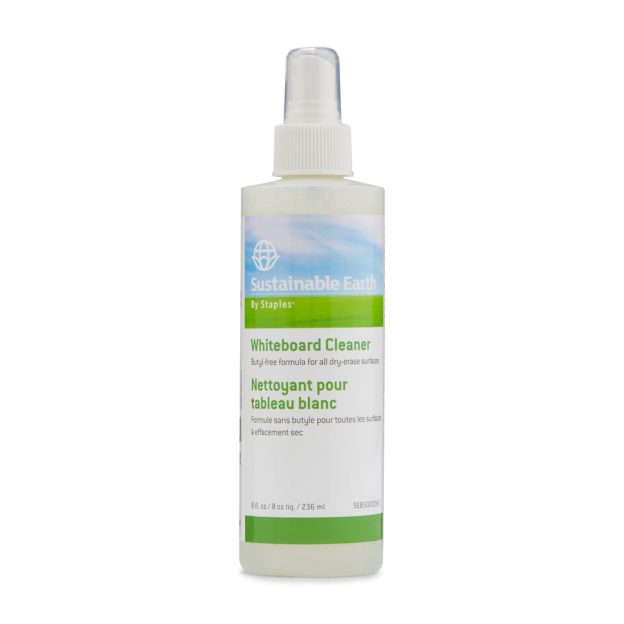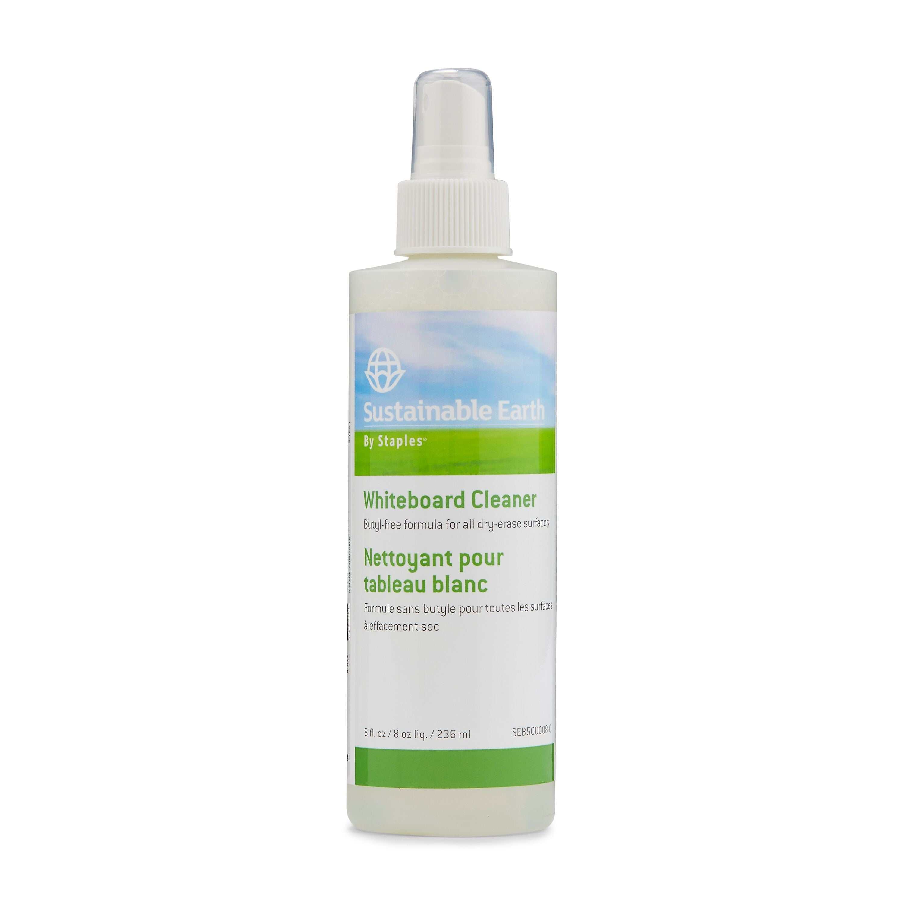 Make whiteboards shine by removing stains, smudges and ghost marks with this 8-ounce bottle of multi whiteboard cleaner. This solution contains bio-based cleaning agents that effectively clean while remaining environmentally safe, making this bottle a good choice for green-minded businesses. This Sustainable Earth by Staples bottle of multi whiteboard cleaner has a low-odor formulation for minimum disruption, and the spray bottle makes it simple to apply.