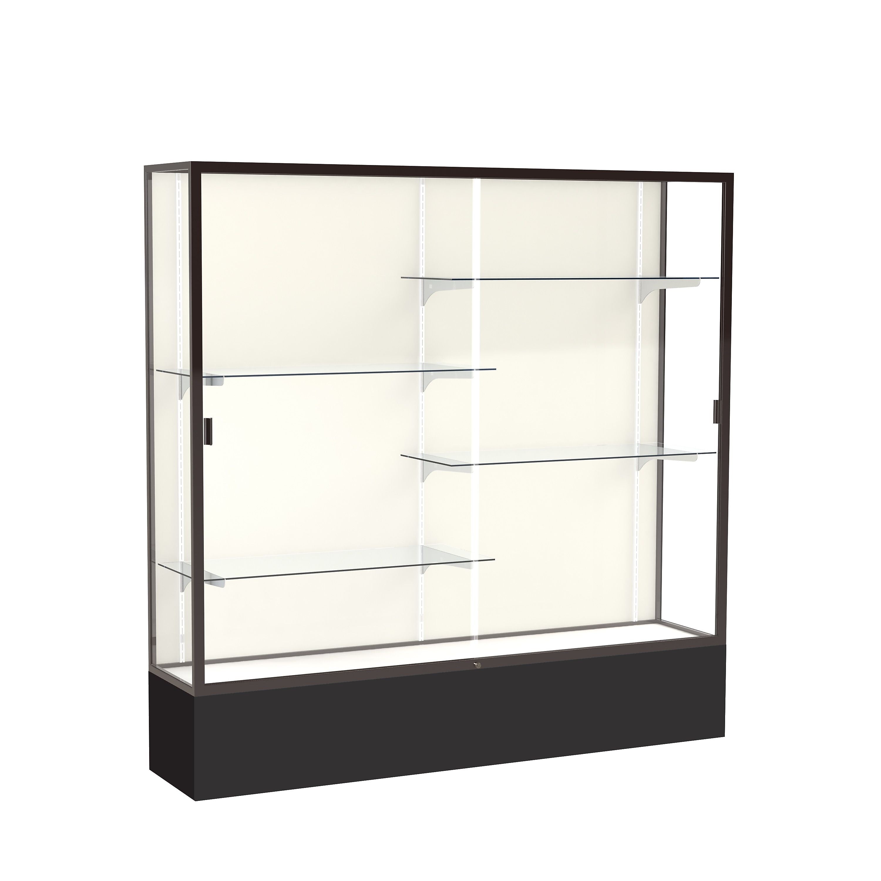WADDELL's Spirit floor cases are the perfect solution to show off your school pride or add color to your business. Features include a vibrant colored 12" high base, anodized aluminum framing and four half-length shelves. Sliding tempered glass doors inc lude built-in locks.